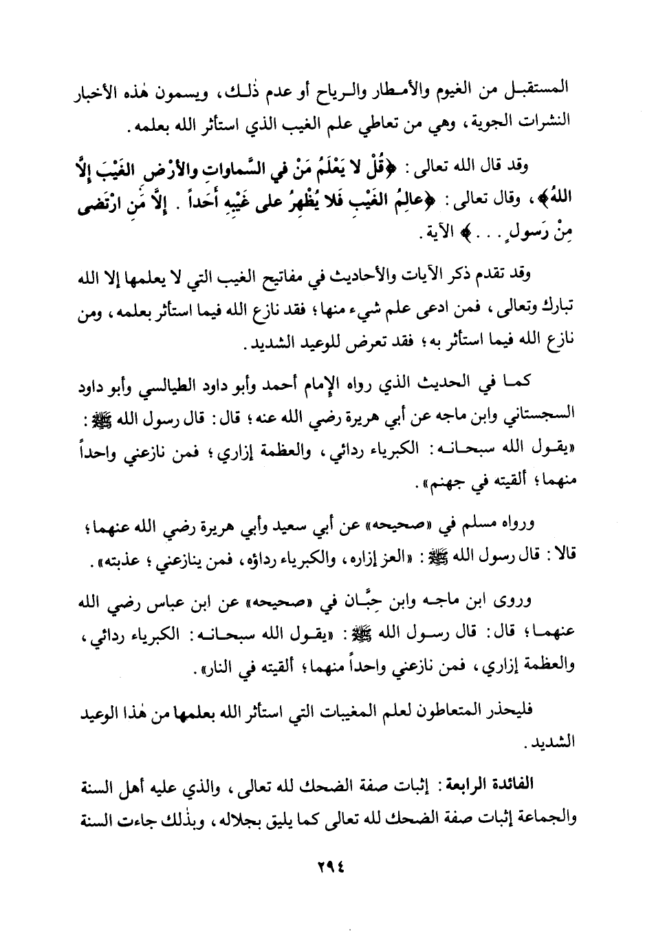 الفائدة الرابعة: إثبات صفة الضحك لله تعالى، والذي عليه أهل السنة والجماعة إثبات صفة الضحك لله تعالى كما يليق بجلاله، وبذلك جاءت السنة