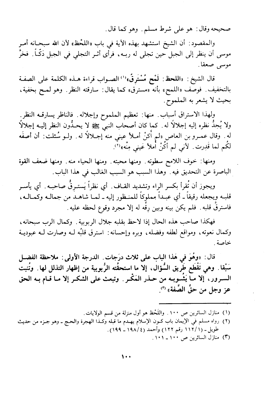 قَالَ الشَّيْخُ: " اللَّحْظُ: لَمْحٌمُسْتَرِقٌ " الصَّوَابُ قِرَاءَةُ هَذِهِ الْكَلِمَةِ عَلَى الصِّفَةِ بِالتَّخْفِيفِ. فَوَصَفَ اللَّمْحَ بِأَنَّهُمُسْتَرِقٌ كَمَا يُقَالُ: سَارَقْتُهُ النَّظَرَ. وَهُوَ لَمْحٌ بِخُفْيَةٍ، بِحَيْثُ لَا يَشْعُرُ بِهِ الْمَلْمُوحُ.