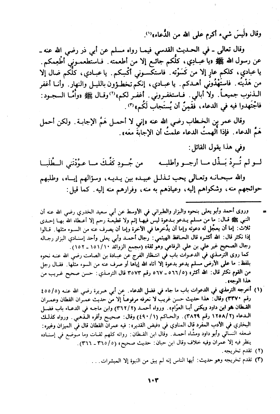 وَقَالَ تَعَالَى - فِي الْحَدِيثِ الْقُدْسِيِّ فِيمَا رَوَاهُ مُسْلِمٌ عَنْ أَبِي ذَرٍّ رَضِيَ اللَّهُ عَنْهُ - عَنْ رَسُولِ اللَّهِ - صَلَّى اللَّهُ عَلَيْهِ وَسَلَّمَ - «يَا عِبَادِي، كُلُّكُمْ جَائِعٌ إِلَّا مَنْ أَطْعَمْتُهُ. فَاسْتَطْعِمُونِي أُطْعِمْكُمْ. يَا عِبَادِي، كُلُّكُمْ عَارٍ إِلَّا مِنْ كَسَوْتُهُ. فَاسْتَكْسُونِي أَكْسُكُمْ. يَا عِبَادِي، كُلُّكُمْ ضَالٌّ إِلَّا مَنْ هَدَيْتُهُ. فَاسْتَهْدُونِي أَهْدِكُمْ. يَا عِبَادِي، إِنَّكُمْ تُخْطِئُونَ بِاللَّيْلِ وَالنَّهَارِ. وَأَنَا أَغْفِرُ الذُّنُوبَ جَمِيعًا وَلَا أُبَالِي. فَاسْتَغْفِرُونِي أَغْفِرْ لَكُمْ» .