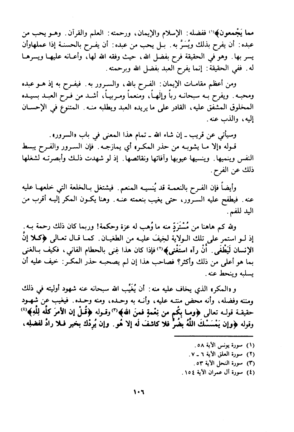 وَمِنْ أَعْظَمِ مَقَامَاتِ الْإِيمَانِ: الْفَرَحُ بِاللَّهِ، وَالسُّرُورُ بِهِ. فَيَفْرَحُ بِهِ إِذْ هُوَ عَبْدُهُ وَمُحِبُّهُ. وَيَفْرَحُ بِهِ سُبْحَانَهُ رَبًّا وَإِلَهًا، وَمُنْعِمًا وَمُرَبِّيًا، أَشَدَّ مِنْ فَرَحِ الْعَبْدِ بِسَيِّدِهِ الْمَخْلُوقِ الْمُشْفِقِ عَلَيْهِ، الْقَادِرِ عَلَى مَا يُرِيدُهُ الْعَبْدُ وَيَطْلُبُهُ مِنْهُ. الْمُتَنَوِّعُ فِي الْإِحْسَانِ إِلَيْهِ، وَالذَّبِّ عَنْهُ.