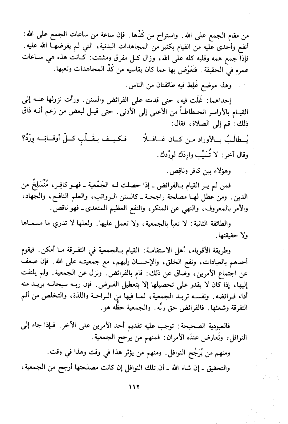 فَمَنْ لَمْ يَرَ الْقِيَامَ بِالْفَرَائِضِ - إِذَا حَصَلَتْ لَهُ الْجَمْعِيَّةُ - فَهُوَ كَافِرٌ، مُنْسَلِخٌ مِنَ الدِّينِ. وَمِنْ عَطَّلَ لَهَا مَصْلَحَةً رَاجِحَةً - كَالسُّنَنِ الرَّوَاتِبِ، وَالْعِلْمِ النَّافِعِ، وَالْجِهَادِ، وَالْأَمْرِ بِالْمَعْرُوفِ، وَالنَّهْيِ عَنِ الْمُنْكَرِ، وَالنَّفْعِ الْعَظِيمِ الْمُتَعَدِّي - فَهُوَ نَاقِصٌ.