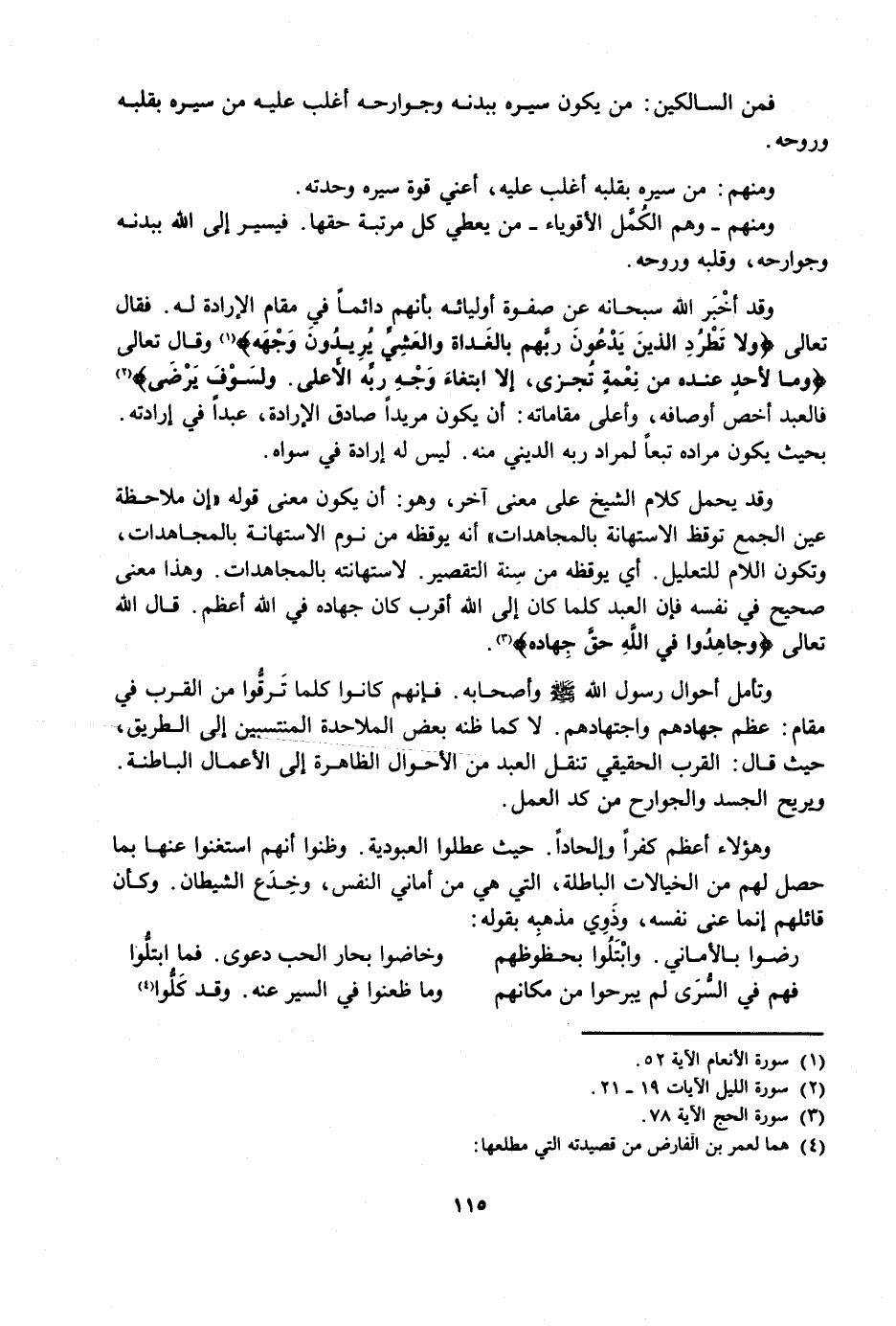 وَتَأَمَّلْ أَحْوَالَ رَسُولِ اللَّهِ - صَلَّى اللَّهُ عَلَيْهِ وَسَلَّمَ - وَأَصْحَابِهِ. فَإِنَّهُمْ كَانُوا كُلَّمَا تَرَقَّوْا مِنَ الْقُرْبِ فِي مَقَامٍ: عَظُمَ جِهَادُهُمْ وَاجْتِهَادُهُمْ: لَا كَمَا ظَنَّهُ بَعْضُ الْمَلَاحِدَةِ الْمُنْتَسِبِينَ إِلَى الطَّرِيقِ، حَيْثُ قَالَ: الْقُرْبُ الْحَقِيقِيُّ تَنَقُّلُ الْعَبْدِ مِنَ الْأَحْوَالِ الظَّاهِرَةِ إِلَى الْأَعْمَالِ الْبَاطِنَةِ. وَيُرِيحُ الْجَسَدَ وَالْجَوَارِحَ مِنْ كَدِّ الْعَمَلِ.