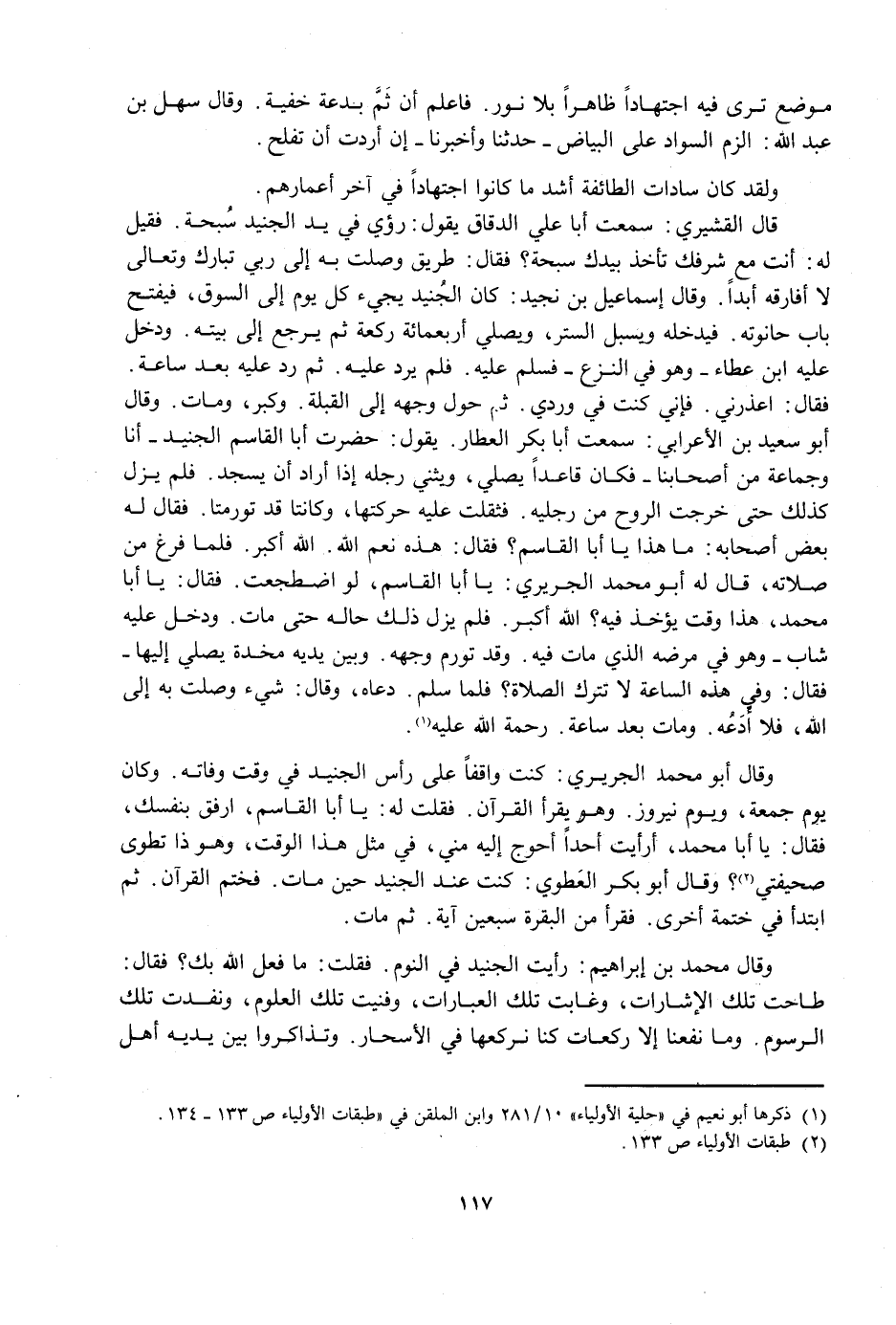 وَقَالَ أَبُو سَعِيدِ بْنُ الْأَعْرَابِيِّ: سَمِعْتُ أَبَا بَكْرٍ الْعَطَّارَ يَقُولُ: حَضَرْتُ أَبَا الْقَاسِمِ الْجُنَيْدَ - أَنَا وَجَمَاعَةٌ مِنْ أَصْحَابِنَا - فَكَانَ قَاعِدًا يُصَلِّي، وَيَثْنِي رِجْلَهُ إِذَا أَرَادَ أَنْ يَسْجُدَ. فَلَمْ يَزَلْ كَذَلِكَ حَتَّى خَرَجَتِ الرُّوحُ مِنْ رِجْلَيْهِ. فَثَقُلَتْ عَلَيْهِ حَرَكَتُهَا، وَكَانَتَا قَدْ تَوَرَّمَتَا.