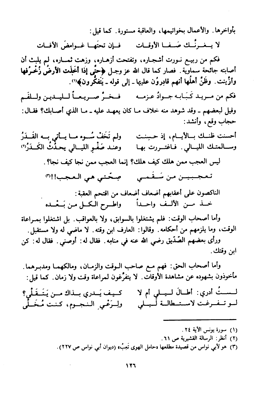 وَرَأَى بَعْضُهُمُ الصِّدِّيقَ - رَضِيَ اللَّهُ عَنْهُ - فِي مَنَامِهِ. فَقَالَ لَهُ: أَوْصِنِي. فَقَالَ لَهُ: كُنِ ابْنَ وَقْتِكَ.