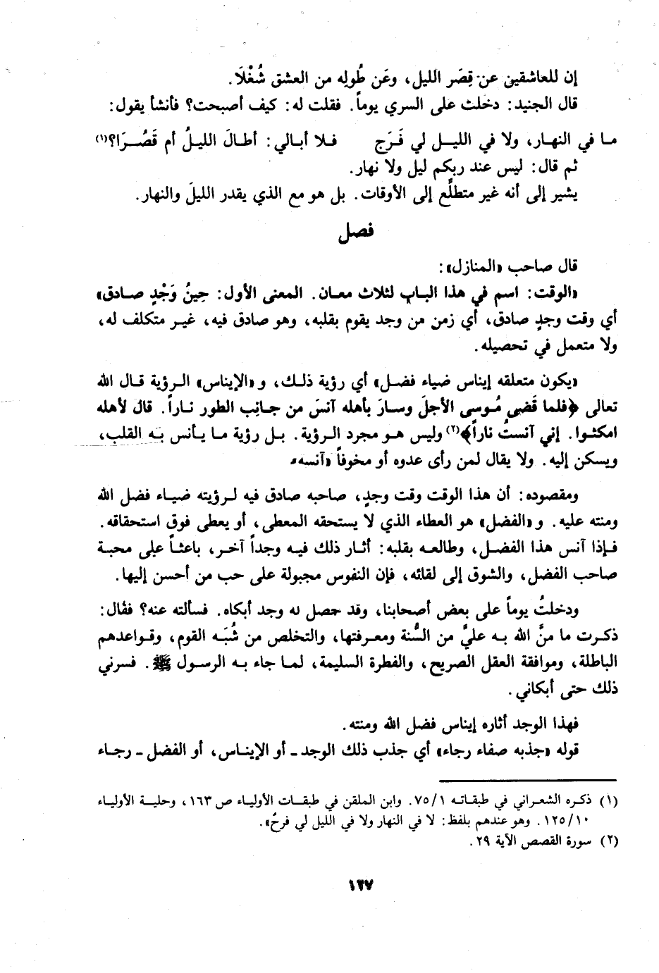 الْوَقْتُ: اسْمٌ فِي هَذَا الْبَابِ لِثَلَاثِ مَعَانٍ. الْمَعْنَى الْأَوَّلُ: حِينَ وَجْدٍ صَادِقٍ. أَيْ وَقْتُ وَجْدٍ صَادِقٍ، أَيْ زَمَنُ مَنْ وَجَدَ يَقُومُ بِقَلْبِهِ، وَهُوَ صَادِقٌ فِيهِ، غَيْرُ مُتَكَلِّفٍ لَهُ، وَلَا مُتَعَمِّلٍ فِي تَحْصِيلِهِ.