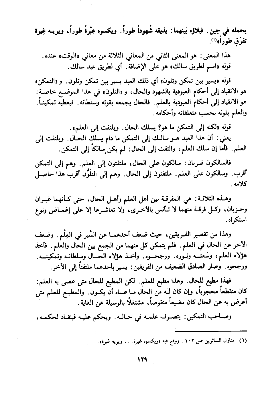 فَالسَّالِكُونَ ضَرْبَانِ: سَالِكُونَ عَلَى الْحَالِ، مُلْتَفِتُونَ إِلَى الْعِلْمِ. وَهُمْ إِلَى التَّمَكُّنِ أَقْرَبُ، وَسَالِكُونَ عَلَى الْعِلْمِ. مُلْتَفِتُونَ إِلَى الْحَالِ. وَهُمْ إِلَى التَّلَوُّنِ أَقْرَبُ. هَذَا حَاصِلُ كَلَامِهِ.