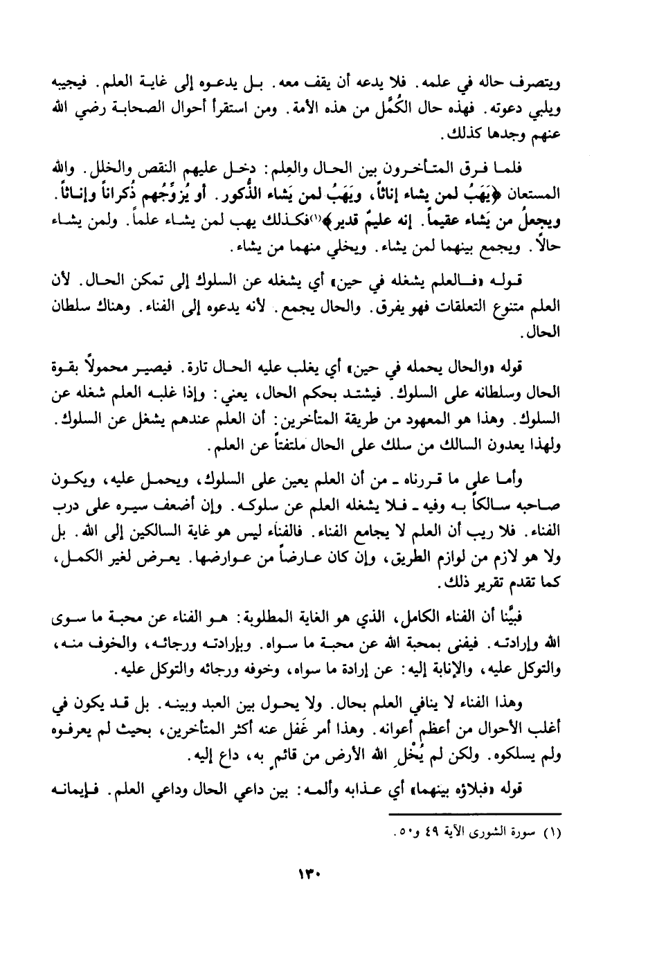 وَهَذَا الْفَنَاءُ لَا يُنَافِي الْعِلْمَ بِحَالٍ. وَلَا يَحُولُ بَيْنَ الْعَبْدِ وَبَيْنَهُ. بَلْ قَدْ يَكُونُ فِي أَغْلَبِ الْأَحْوَالِ مِنْ أَعْظَمِ أَعْوَانِهِ. وَهَذَا أَمْرٌ غَفَلَ عَنْهُ أَكْثَرُ الْمُتَأَخِّرِينَ، بِحَيْثُ لَمْ يَعْرِفُوهُ وَلَمْ يَسْلُكُوهُ. وَلَكِنْ لَمْ يُخْلِ اللَّهُ الْأَرْضَ مِنْ قَائِمٍ بِهِ، دَاعٍ إِلَيْهِ.