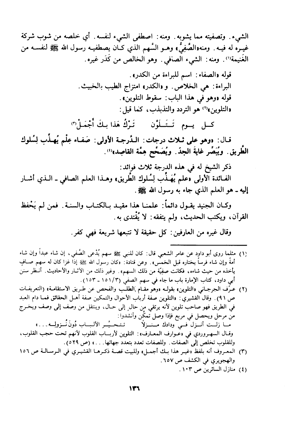 قَالَ: وَهُوَ عَلَى ثَلَاثِ دَرَجَاتٍ. الدَّرَجَةُ الْأُولَى: صَفَاءُ عِلْمٍ يُهَذِّبُ لِسُلُوكِ الطَّرِيقِ. وَيُبَصِّرُ غَايَةَ الْجِدِّ. وَيُصَحِّحُ هِمَّةَ الْقَاصِدِ.