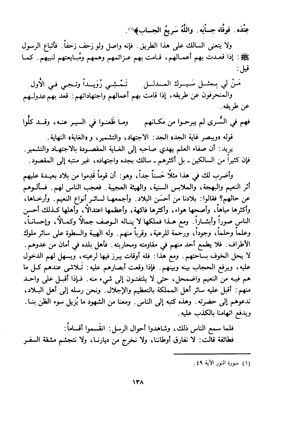 وَلَا يَتَعَنَّى السَّالِكُ عَلَى هَذَا الطَّرِيقِ. فَإِنَّهُ وَاصِلٌ وَلَوْ زَحَفَ زَحْفًا. فَأَتْبَاعُ الرَّسُولِ - صَلَّى اللَّهُ عَلَيْهِ وَسَلَّمَ -: إِذَا قَعَدَتْ بِهِمْ أَعْمَالُهُمْ، قَامَتْ بِهِمْ عَزَائِمُهُمْ وَهِمَمُهُمْ وَمُتَابَعَتُهُمْ لِنَبِيِّهِمْ. كَمَا قِيلَ: