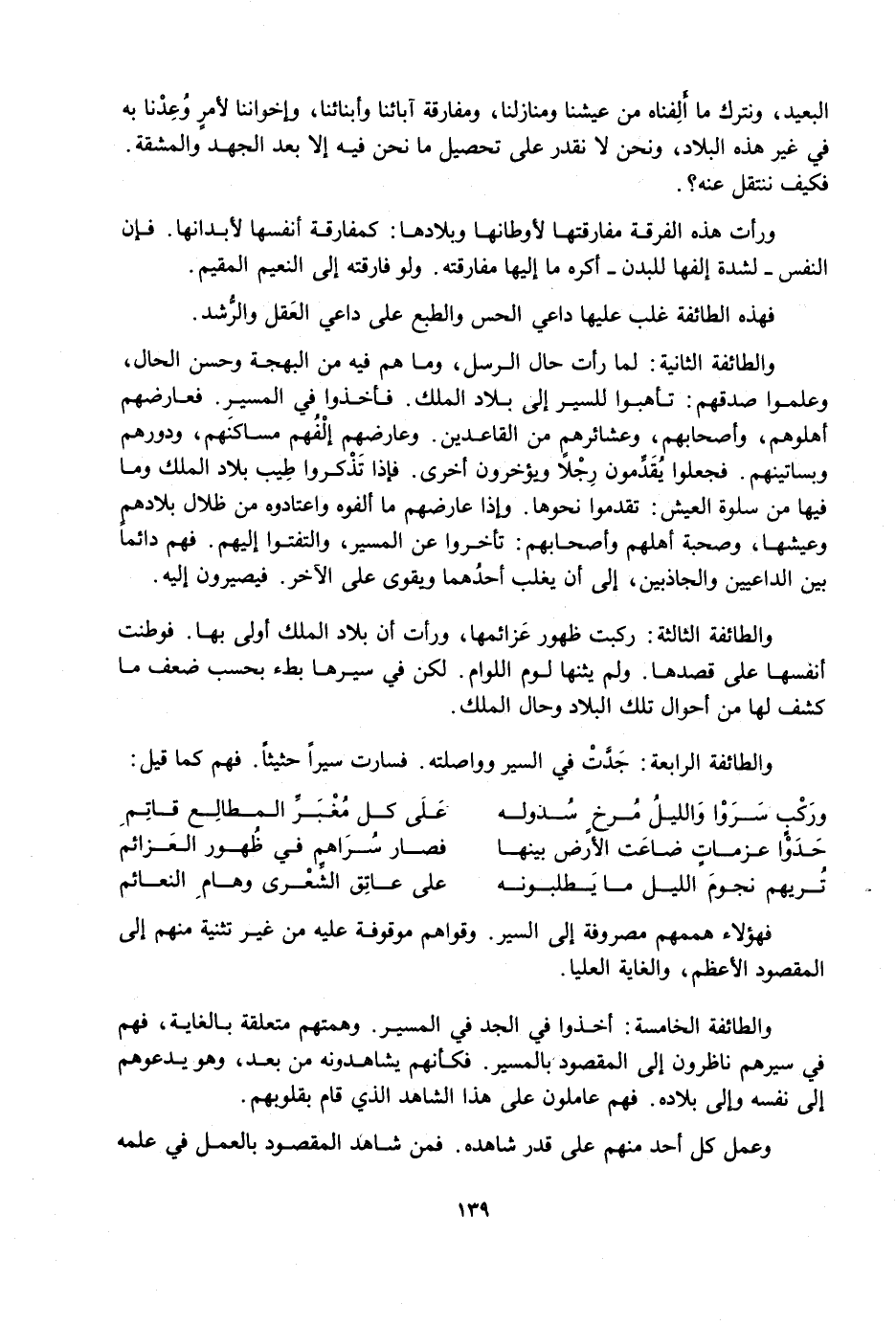 الْبَعِيدِ، وَنَتْرُكُ مَا أَلِفْنَاهُ مِنْ عَيْشِنَا وَمَنَازِلِنَا، وَمُفَارَقَةِ آبَائِنَا وَأَبْنَائِنَا، وَإِخْوَانِنَا لِأَمْرٍ وُعِدْنَا بِهِ فِي غَيْرِ هَذِهِ الْبِلَادِ، وَنَحْنُ لَا نَقْدِرُ عَلَى تَحْصِيلِ مَا نَحْنُ فِيهِ إِلَّا بَعْدَ الْجَهْدِ وَالْمَشَقَّةِ. فَكَيْفَ نَنْتَقِلُ عَنْهُ؟