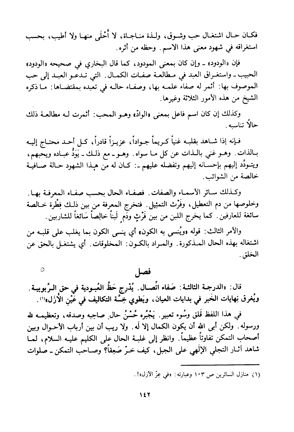 فَإِنَّ الْوَدُودَ - وَإِنْ كَانَ بِمَعْنَى الْمَوْدُودِ، كَمَا قَالَ الْبُخَارِيُّ فِي صَحِيحِهِ: الْوَدُودُ الْحَبِيبُ - وَاسْتِغْرَاقُ الْعَبْدِ فِي مُطَالَعَةِ صِفَاتِ الْكَمَالِ الَّتِي تَدْعُو الْعَبْدَ إِلَى حُبِّ الْمَوْصُوفِ بِهَا: أَثْمَرَ لَهُ صَفَاءَ عِلْمِهِ بِهَا، وَصَفَاءَ حَالِهِ فِي تَعَبُّدِهِ بِمُقْتَضَاهَا: مَا ذَكَرَهُ الشَّيْخُ مِنْ هَذِهِ الْأُمُورِ الثَّلَاثَةِ وَغَيْرِهَا.