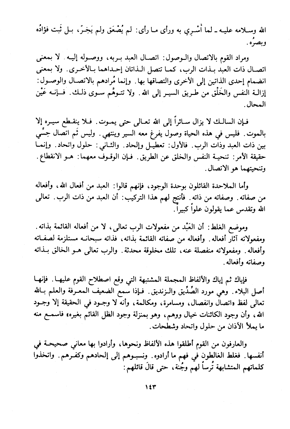 وَمُرَادُ الْقَوْمِ بِالِاتِّصَالِ وَالْوُصُولِ: اتِّصَالُ الْعَبْدِ بِرَبِّهِ، وَوُصُولُهُ إِلَيْهِ. لَا بِمَعْنَى اتِّصَالِ ذَاتِ الْعَبْدِ بِذَاتِ الرَّبِّ، كَمَا تَتَّصِلُ الذَّاتَانِ إِحْدَاهُمَا بِالْأُخْرَى. وَلَا بِمَعْنَى انْضِمَامِ إِحْدَى الذَّاتَيْنِ إِلَى الْأُخْرَى وَالْتِصَاقِهَا بِهَا. وَإِنَّمَا مُرَادُهُمْ بِالِاتِّصَالِ وَالْوُصُولِ: إِزَالَةُ النَّفْسِ وَالْخَلْقِ مِنْ طَرِيقِ السَّيْرِ إِلَى اللَّهِ. وَلَا تَتَوَهَّمْ سِوَى ذَلِكَ. فَإِنَّهُ عَيْنُ الْمُحَالِ.