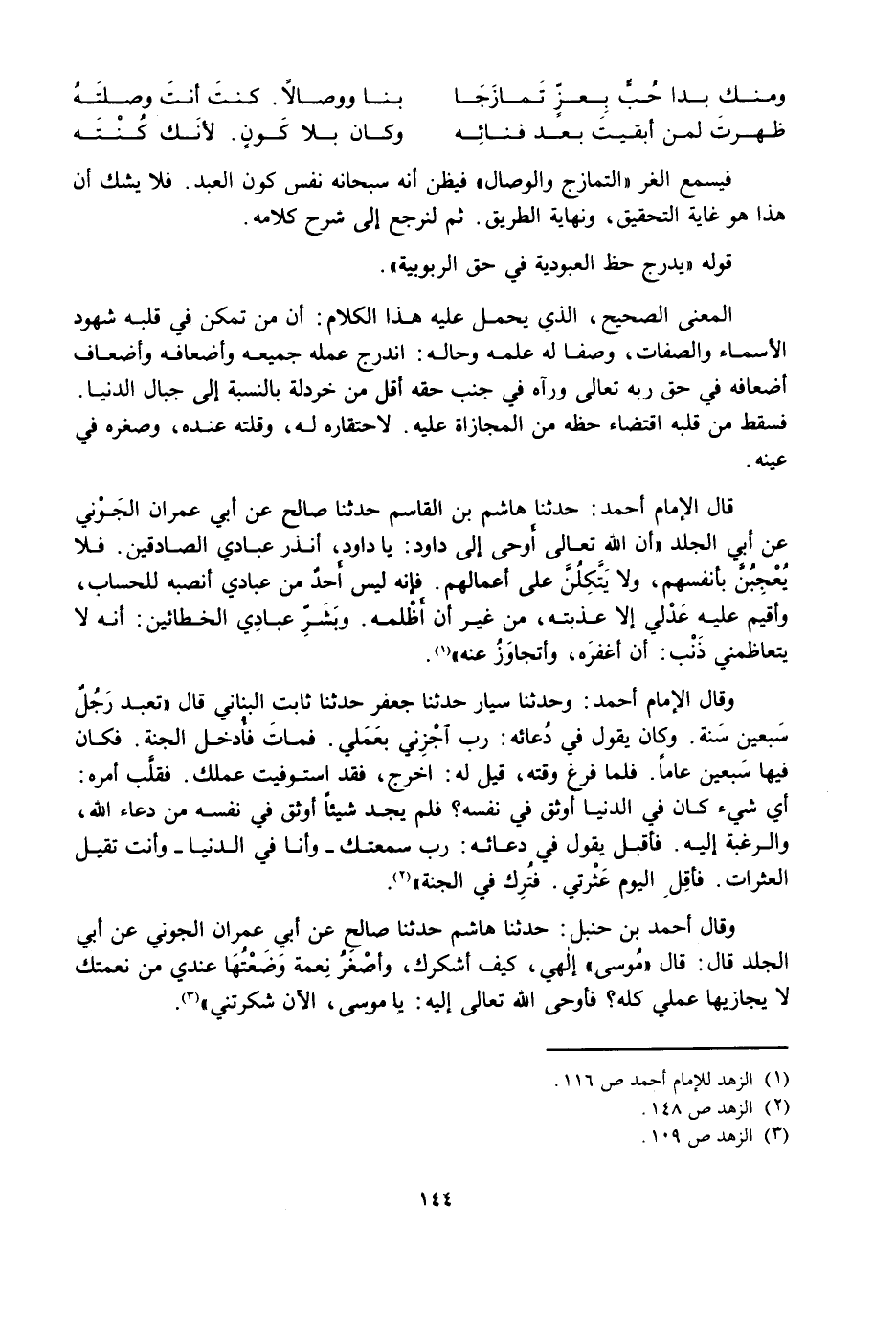 وَقَالَ أَحْمَدُ بْنُ حَنْبَلٍ: حَدَّثَنَا هَاشِمٌ حَدَّثَنَا صَالِحٌ عَنْ أَبِي عِمْرَانَ الْجَوْنِيِّ عَنْ أَبِي الْجِلْدِ قَالَ: قَالَ مُوسَى: إِلَهِي، كَيْفَ أَشْكُرُكَ، وَأَصْغَرُ نِعْمَةٍ وَضَعْتَهَا عِنْدِي مِنْ نِعْمَتِكَ لَا يُجَازِيهَا عَمَلِي كُلُّهُ؟ فَأَوْحَى اللَّهُ تَعَالَى إِلَيْهِ: يَا مُوسَى، الْآنَ شَكَرْتَنِي.