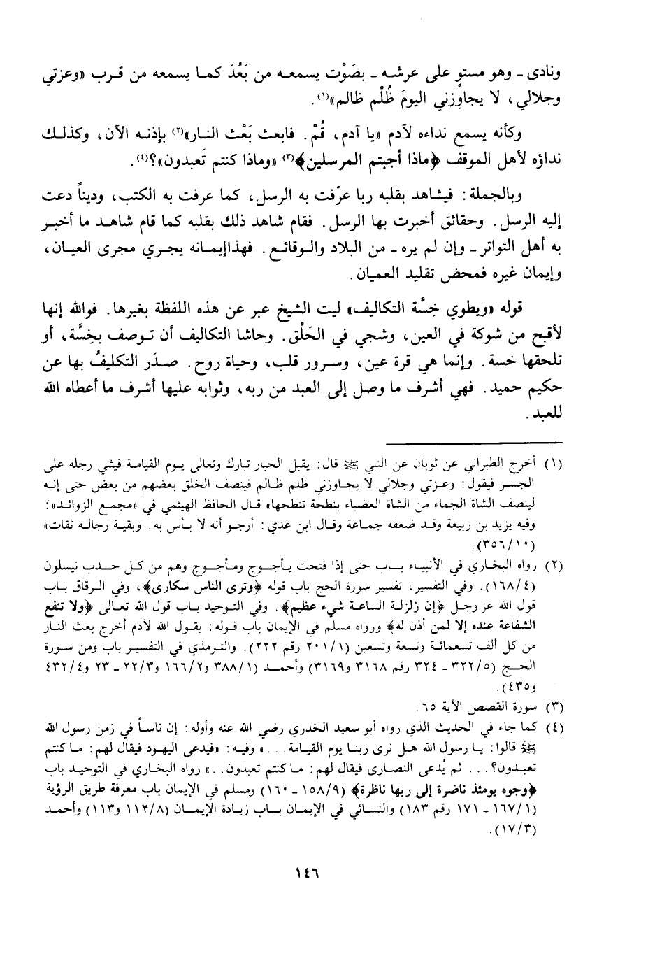 وَبِالْجُمْلَةِ: فَيُشَاهِدُ بِقَلْبِهِ رَبًّا عَرَّفَتْ بِهِ الرُّسُلُ، كَمَا عَرَّفَتْ بِهِ الْكُتُبُ، وَدِينًا دَعَتْ إِلَيْهِ الرُّسُلُ. وَحَقَائِقَ أَخْبَرَتْ بِهَا الرُّسُلُ. فَقَامَ شَاهِدُ ذَلِكَ بِقَلْبِهِ كَمَا قَامَ شَاهِدُ مَا أَخْبَرَ بِهِ أَهْلُ التَّوَاتُرِ - وَإِنْ لَمْ يَرَهُ - مِنَ الْبِلَادِ وَالْوَقَائِعِ. فَهَذَا إِيمَانُهُ يَجْرِي مَجْرَى الْعِيَانِ، وَإِيمَانُ غَيْرِهِ فَمَحْضُ تَقْلِيدِ الْعُمْيَانِ.