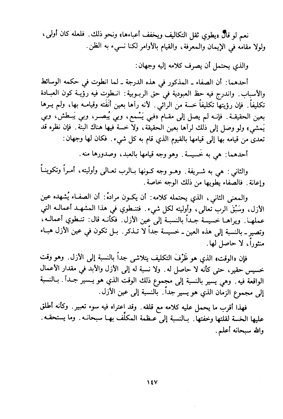 أَحَدُهُمَا: أَنَّ الصَّفَاءَ - الْمَذْكُورَ فِي هَذِهِ الدَّرَجَةِ - لَمَّا انْطَوَتْ فِي حُكْمِهِ الْوَسَائِطُ وَالْأَسْبَابُ. وَانْدَرَجَ فِيهِ حَظُّ الْعُبُودِيَّةِ فِي حَقِّ الرُّبُوبِيَّةِ: انْطَوَتْ فِيهِ رُؤْيَةُ كَوْنِ الْعِبَادَةِ تَكْلِيفًا. فَإِنَّ رُؤْيَتَهَا تَكْلِيفًا خِسَّةٌ مِنَ الرَّائِي. لِأَنَّهُ رَآهَا بِعَيْنِ أَنَفَتِهِ وَقِيَامِهِ بِهَا. وَلَمْ يَرَهَا بِعَيْنِ الْحَقِيقَةِ. فَإِنَّهُ لَمْ يَصِلْ إِلَى مَقَامِ " فَبِي يَسْمَعُ، وَبِي يُبْصِرُ، وَبِي يَبْطِشُ، وَبِي يَمْشِي " وَلَوْ وَصَلَ إِلَى ذَلِكَ لَرَآهَا بِعَيْنِ الْحَقِيقَةِ، وَلَا خِسَّةَ فِيهَا هُنَاكَ أَلْبَتَّةَ. فَإِنَّ نَظَرَهُ قَدْ تَعَدَّى مِنْ قِيَامِهِ بِهَا إِلَى قِيَامِهَا بِالْقَيُّومِ الَّذِي قَامَ بِهِ كُلُّ شَيْءٍ. فَكَانَ لَهَا وَجْهَانِ.
