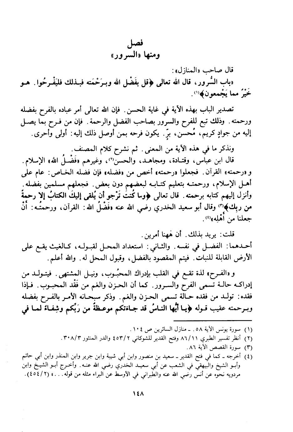 تَصْدِيرُ الْبَابِ بِهَذِهِ الْآيَةِ فِي غَايَةِ الْحُسْنِ. فَإِنَّ اللَّهَ تَعَالَى أَمَرَ عِبَادَهُ بِالْفَرَحِ بِفَضْلِهِ وَرَحْمَتِهِ. وَذَلِكَ تَبَعٌ لِلْفَرَحِ وَالسُّرُورِ بِصَاحِبِ الْفَضْلِ وَالرَّحْمَةِ. فَإِنَّ مَنْ فَرِحَ بِمَا يَصِلُ إِلَيْهِ مِنْ جَوَادٍ كَرِيمٍ، مُحْسِنٍ، بَرٍّ. يَكُونُ فَرَحُهُ بِمَنْ أَوْصَلَ ذَلِكَ إِلَيْهِ: أَوْلَى وَأَحْرَى.