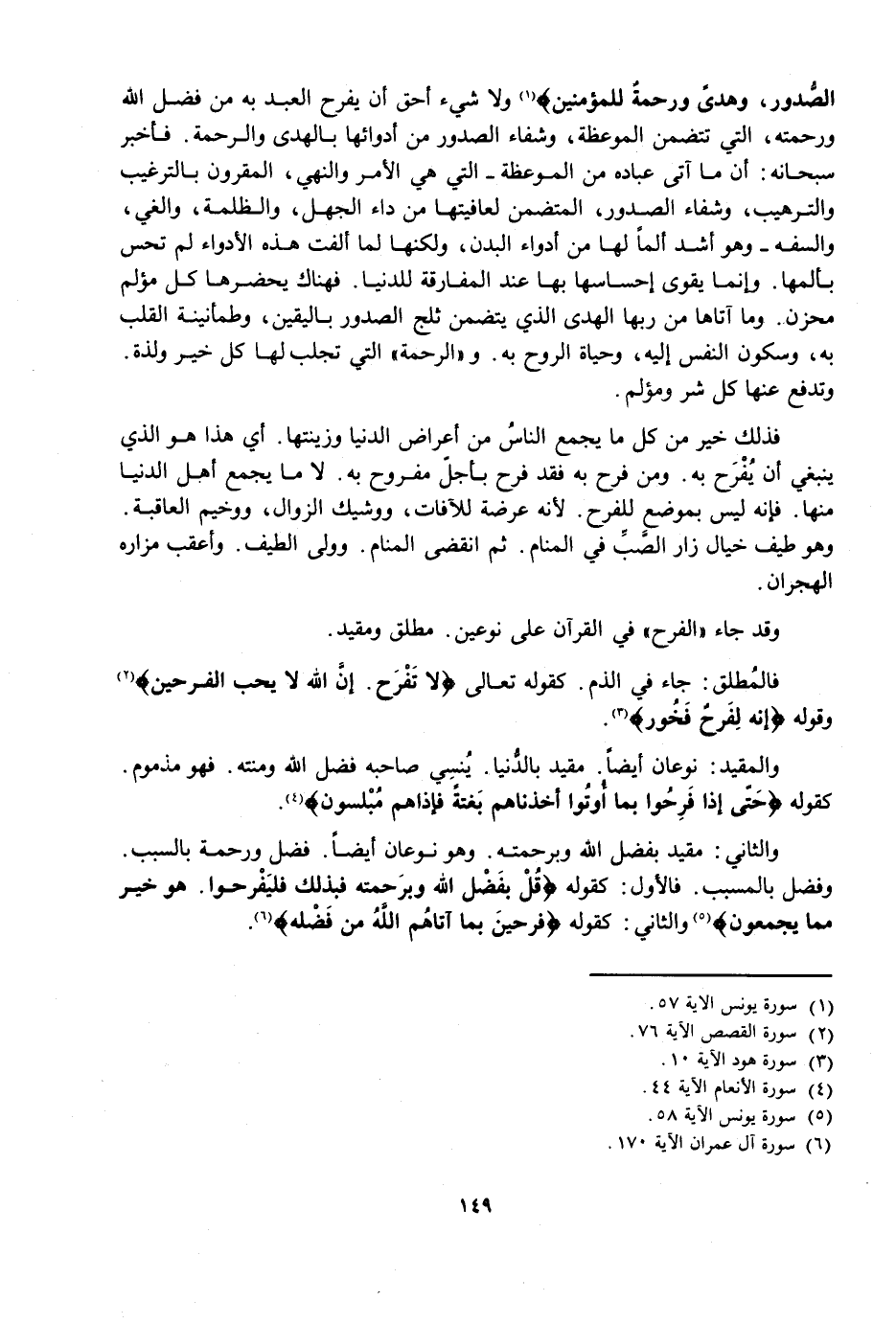 وَلَا شَيْءَ أَحَقُّ أَنْ يَفْرَحَ الْعَبْدُ بِهِ مِنْ فَضْلِ اللَّهِ وَرَحْمَتِهِ، الَّتِي تَتَضَمَّنُ الْمَوْعِظَةَ وَشِفَاءَ الصُّدُورِ مِنْ أَدْوَائِهَا بِالْهُدَى وَالرَّحْمَةِ. فَأَخْبَرَ سُبْحَانَهُ: أَنَّ مَا آتَى عِبَادَهُ مِنَ الْمَوْعِظَةِ - الَّتِي هِيَ الْأَمْرُ وَالنَّهْيُ، الْمَقْرُونُ بِالتَّرْغِيبِ وَالتَّرْهِيبِ، وَشِفَاءَ الصُّدُورِ الْمُتَضَمِّنَ لِعَافِيَتِهَا مِنْ دَاءِ الْجَهْلِ، وَالظُّلْمَةِ، وَالْغَيِّ، وَالسَّفَهِ - وَهُوَ أَشَدُّ أَلَمًا لَهَا مِنْ أَدْوَاءِ الْبَدَنِ، وَلَكِنَّهَا لَمَّا أَلِفَتْ هَذِهِ الْأَدْوَاءَ لَمْ تُحِسَّ بِأَلَمِهَا. وَإِنَّمَا يَقْوَى إِحْسَاسُهَا بِهَا عِنْدَ الْمُفَارَقَةِ لِلدُّنْيَا. فَهُنَاكَ يَحْضُرُهَا كُلُّ مُؤْلِمٍ مُحْزِنٍ. وَمَا آتَاهَا مِنْ رَبِّهَا الْهُدَى الَّذِي يَتَضَمَّنُ ثَلْجَ الصُّدُورِ بِالْيَقِينِ، وَطُمَأْنِينَةَ الْقَلْبِ بِهِ، وَسُكُونَ النَّفْسِ إِلَيْهِ، وَحَيَاةَ الرُّوحِ بِهِ. وَالرَّحْمَةَ الَّتِي تَجْلِبُ لَهَا كُلَّ خَيْرٍ وَلَذَّةٍ. وَتَدْفَعُ عَنْهَا كُلَّ شَرٍّ وَمُؤْلِمٍ.