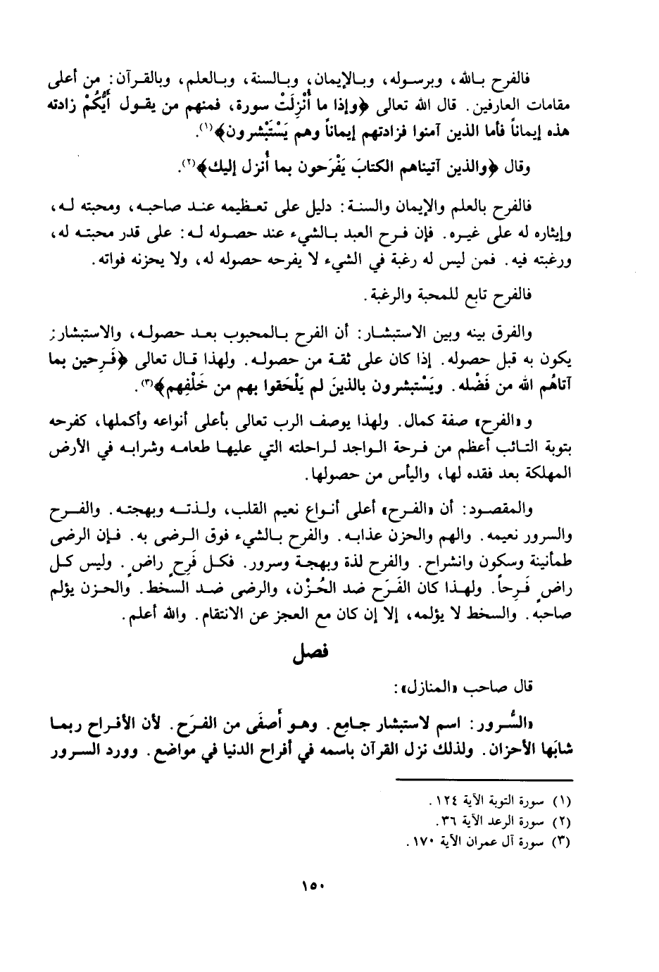 فَالْفَرَحُ بِاللَّهِ، وَبِرَسُولِهِ، وَبِالْإِيمَانِ، وَبِالسُّنَّةِ، وَبِالْعِلْمِ، وَبِالْقُرْآنِ: مِنْ أَعْلَى مَقَامَاتِ الْعَارِفِينَ: قَالَ اللَّهُ تَعَالَى: {وَإِذَا مَا أُنْزِلَتْ سُورَةٌ فَمِنْهُمْ مَنْ يَقُولُ أَيُّكُمْ زَادَتْهُ هَذِهِ إِيمَانًا فَأَمَّا الَّذِينَ آمَنُوا فَزَادَتْهُمْ إِيمَانًا وَهُمْ يَسْتَبْشِرُونَ} [التوبة: 124] .