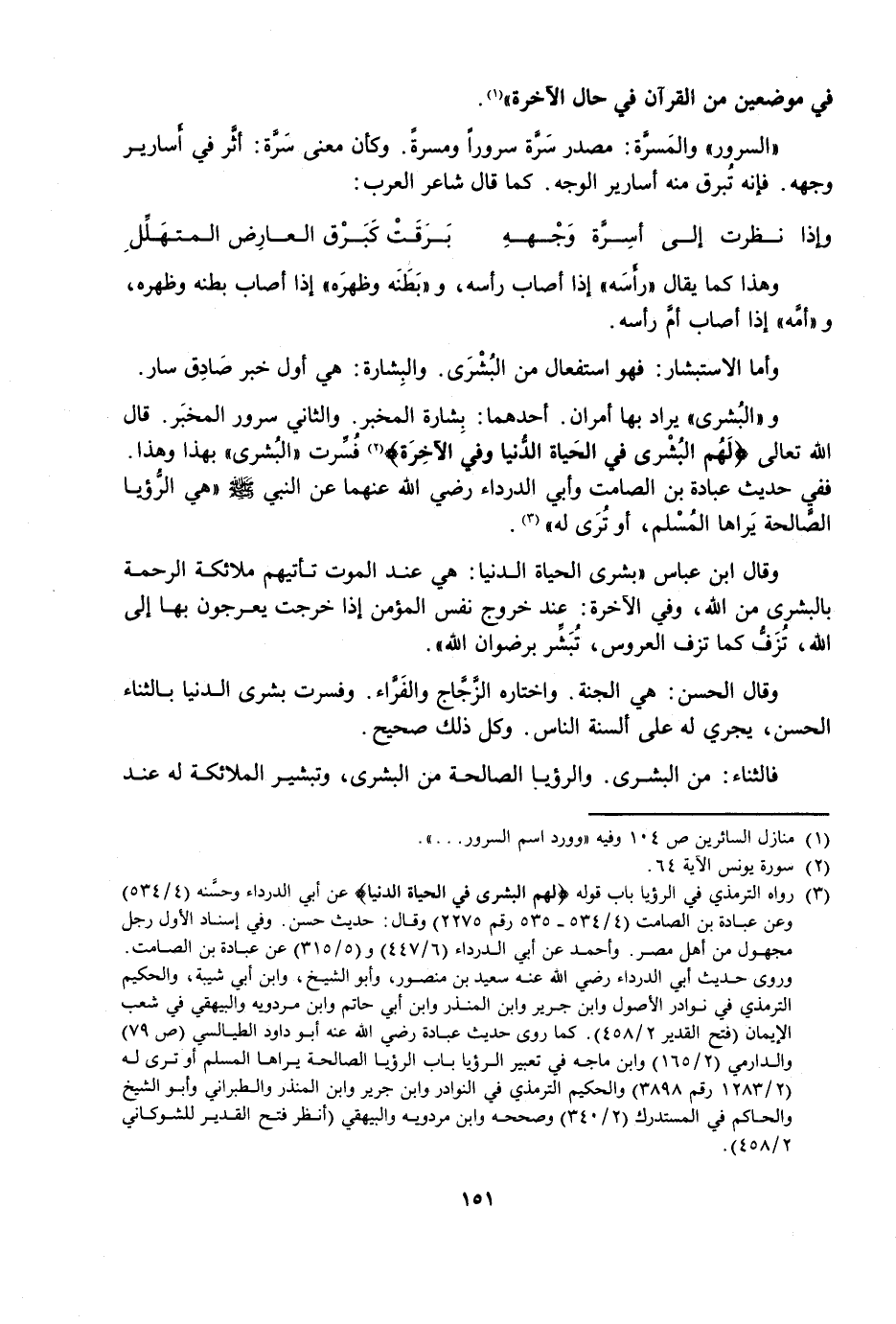 وَ " الْبُشْرَى " يُرَادُ بِهَا أَمْرَانِ. أَحَدُهُمَا: بِشَارَةُ الْمُخْبِرِ. وَالثَّانِي: سُرُورُ الْمُخْبَرِ. قَالَ اللَّهُ تَعَالَى: {لَهُمُ الْبُشْرَى فِي الْحَيَاةِ الدُّنْيَا وَفِي الْآخِرَةِ} [يونس: 64] . فُسِّرَتِ الْبُشْرَى بِهَذَا وَهَذَا. فَفِي حَدِيثِ عُبَادَةَ بْنِ الصَّامِتِ. وَأَبِي الدَّرْدَاءِ رَضِيَ اللَّهُ عَنْهُمَا. عَنِ النَّبِيِّ صَلَّى اللَّهُ عَلَيْهِ وَسَلَّمَ: «هِيَ الرُّؤْيَا الصَّالِحَةُ يَرَاهَا الْمُسْلِمُ، أَوْ تُرَى لَهُ» .