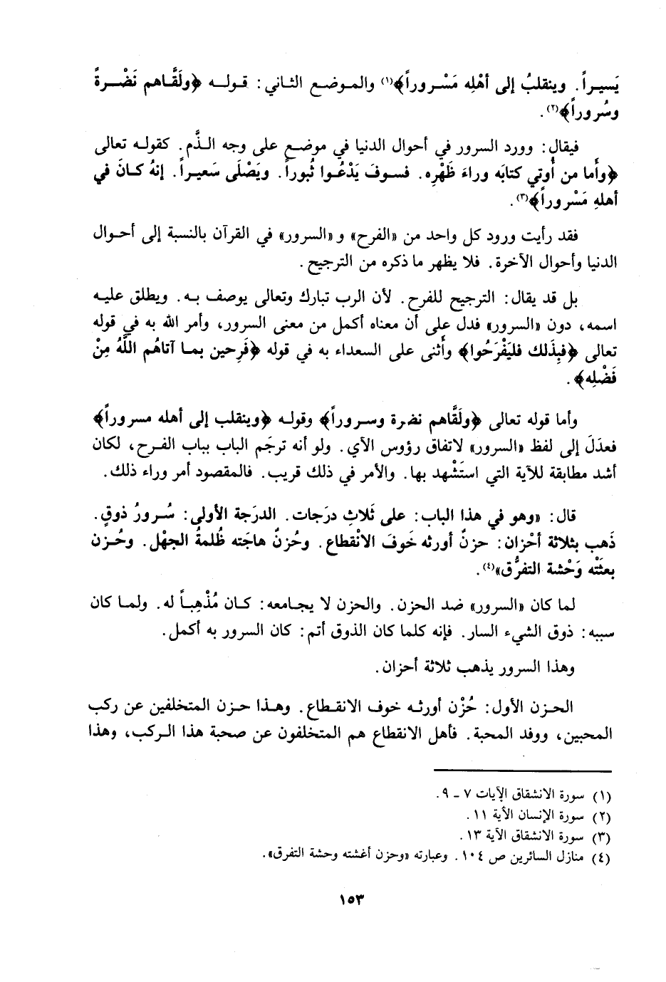 قَالَ: وَهُوَ فِي هَذَا الْبَابِ: عَلَى ثَلَاثِ دَرَجَاتٍ. الدَّرَجَةُ الْأُولَى: سُرُورُ ذَوْقٍ. ذَهَبَ بِثَلَاثَةِ أَحْزَانٍ: حُزْنٌ أَوْرَثَهُ خَوْفُ الِانْقِطَاعِ. وَحُزْنٌ هَاجَمَتْهُ ظُلْمَةُ الْجَهْلِ. وَحُزْنٌ بَعَثَتْهُ وَحْشَةُ التَّفَرُّقِ.