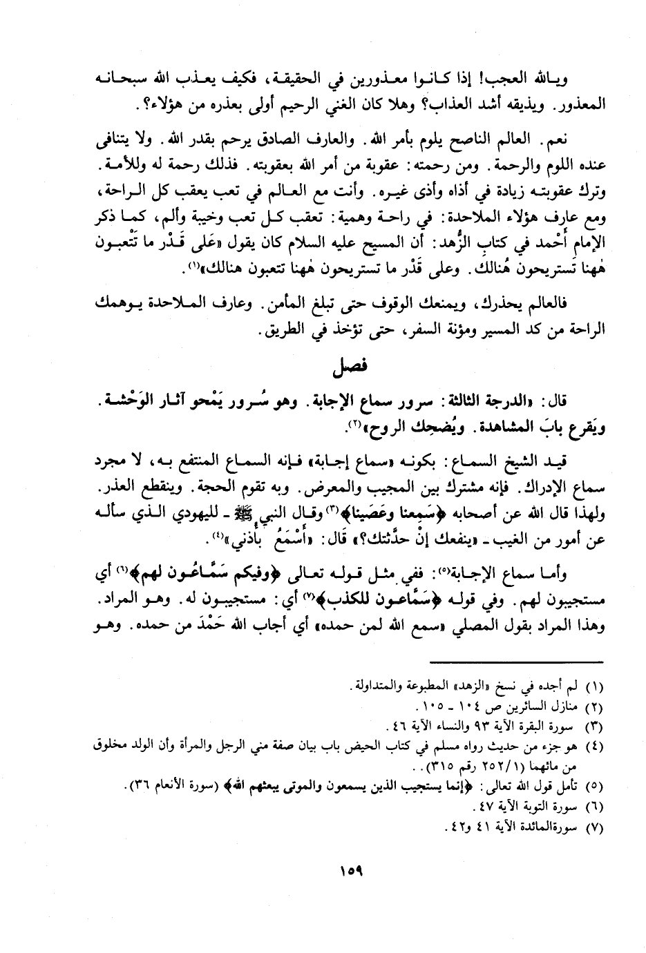 قَيَّدَ الشَّيْخُ السَّمَاعَ: بِكَوْنِهِ سَمَاعَ إِجَابَةٍ فَإِنَّهُ السَّمَاعُ الْمُنْتَفَعُ بِهِ، لَا مُجَرَّدَ سَمَاعِ الْإِدْرَاكِ. فَإِنَّهُ مُشْتَرَكٌ بَيْنَ الْمُجِيبِ وَالْمُعْرِضِ. وَبِهِ تَقُومُ الْحُجَّةُ وَيَنْقَطِعُ الْعُذْرُ. وَلِهَذَا قَالَ اللَّهُ عَنْ أَصْحَابِهِ {سَمِعْنَا وَعَصَيْنَا} [البقرة: 93] «وَقَالَ النَّبِيُّ - صَلَّى اللَّهُ عَلَيْهِ وَسَلَّمَ - لِلْيَهُودِيِّ الَّذِي سَأَلَهُ عَنْ أُمُورِ الْغَيْبِ -: يَنْفَعُكَ إِنْ حَدَّثْتُكَ؟ قَالَ: أَسْمَعُ بِأُذُنِي.»