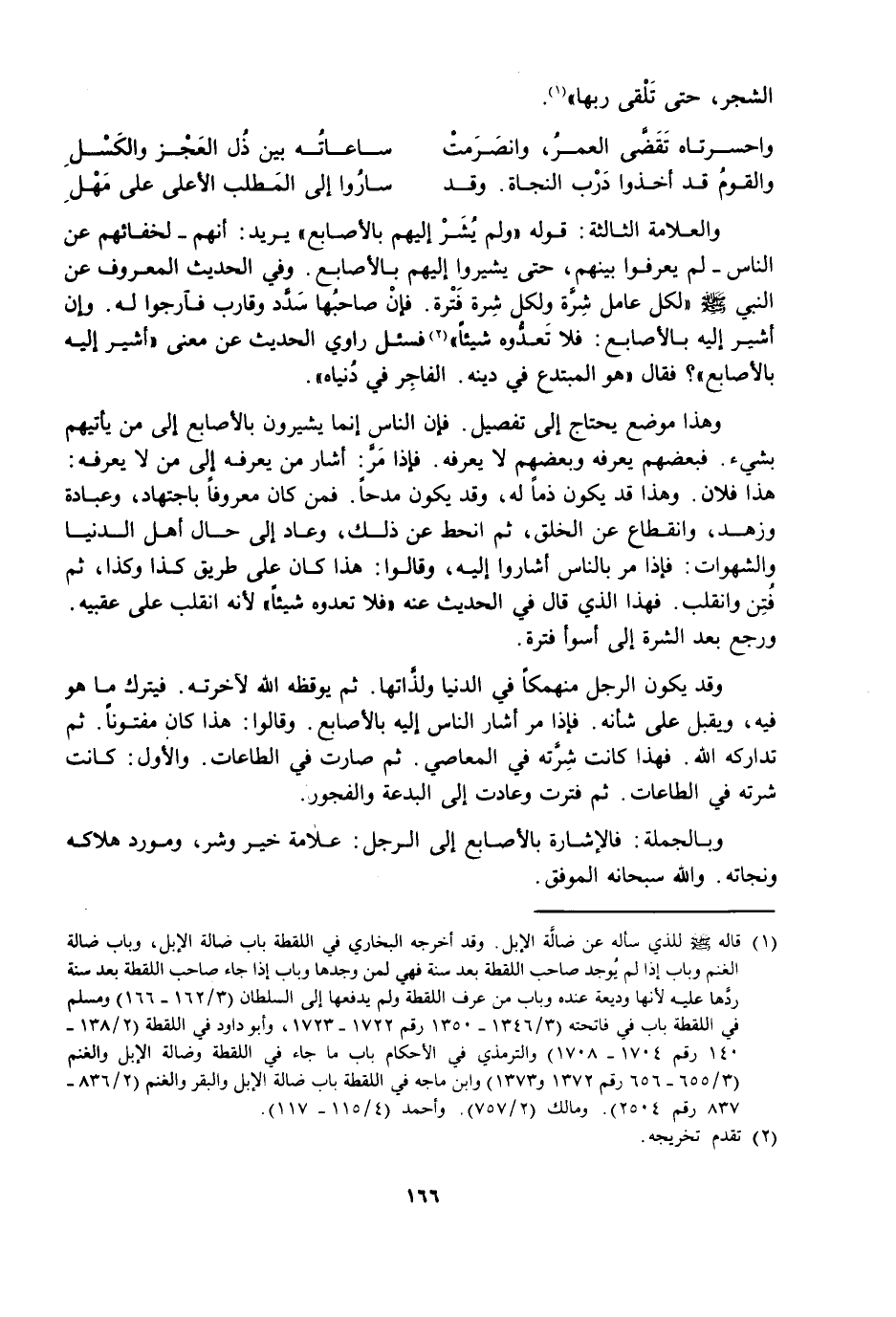وَهَذَا مَوْضِعٌ يَحْتَاجُ إِلَى تَفْصِيلٍ، فَإِنَّ النَّاسَ إِنَّمَا يُشِيرُونَ بِالْأَصَابِعِ إِلَى مَنْ يَأْتِيهِمْ بِشَيْءٍ، فَبَعْضُهُمْ يَعْرِفُهُ وَبَعْضُهُمْ لَا يَعْرِفُهُ، فَإِذَا مَرَّ: أَشَارَ مَنْ يَعْرِفُهُ إِلَى مَنْ لَا يَعْرِفُهُ: هَذَا فُلَانٌ، وَهَذَا قَدْ يَكُونُ ذَمًّا لَهُ، وَقَدْ يَكُونُ مَدْحًا، فَمَنْ كَانَ مَعْرُوفًا بِاجْتِهَادٍ وَعِبَادَةٍ وَزُهْدٍ وَانْقِطَاعٍ عَنِ الْخَلْقِ، ثُمَّ انْحَطَّ عَنْ ذَلِكَ، وَعَادَ إِلَى حَالِ أَهْلِ الدُّنْيَا وَالشَّهَوَاتِ: فَإِذَا مَرَّ بِالنَّاسِ أَشَارُوا إِلَيْهِ، وَقَالُوا: هَذَا كَانَ عَلَى طَرِيقِ كَذَا وَكَذَا، ثُمَّ فُتِنَ وَانْقَلَبَ، فَهَذَا الَّذِي قَالَ فِي الْحَدِيثِ عَنْهُ: " فَلَا تَعُدُّوهُ شَيْئًا " لِأَنَّهُ انْقَلَبَ عَلَى عَقِبَيْهِ، وَرَجَعَ بَعْدَ الشِّرَّةِ إِلَى أَسْوَأِ فَتْرَةٍ.