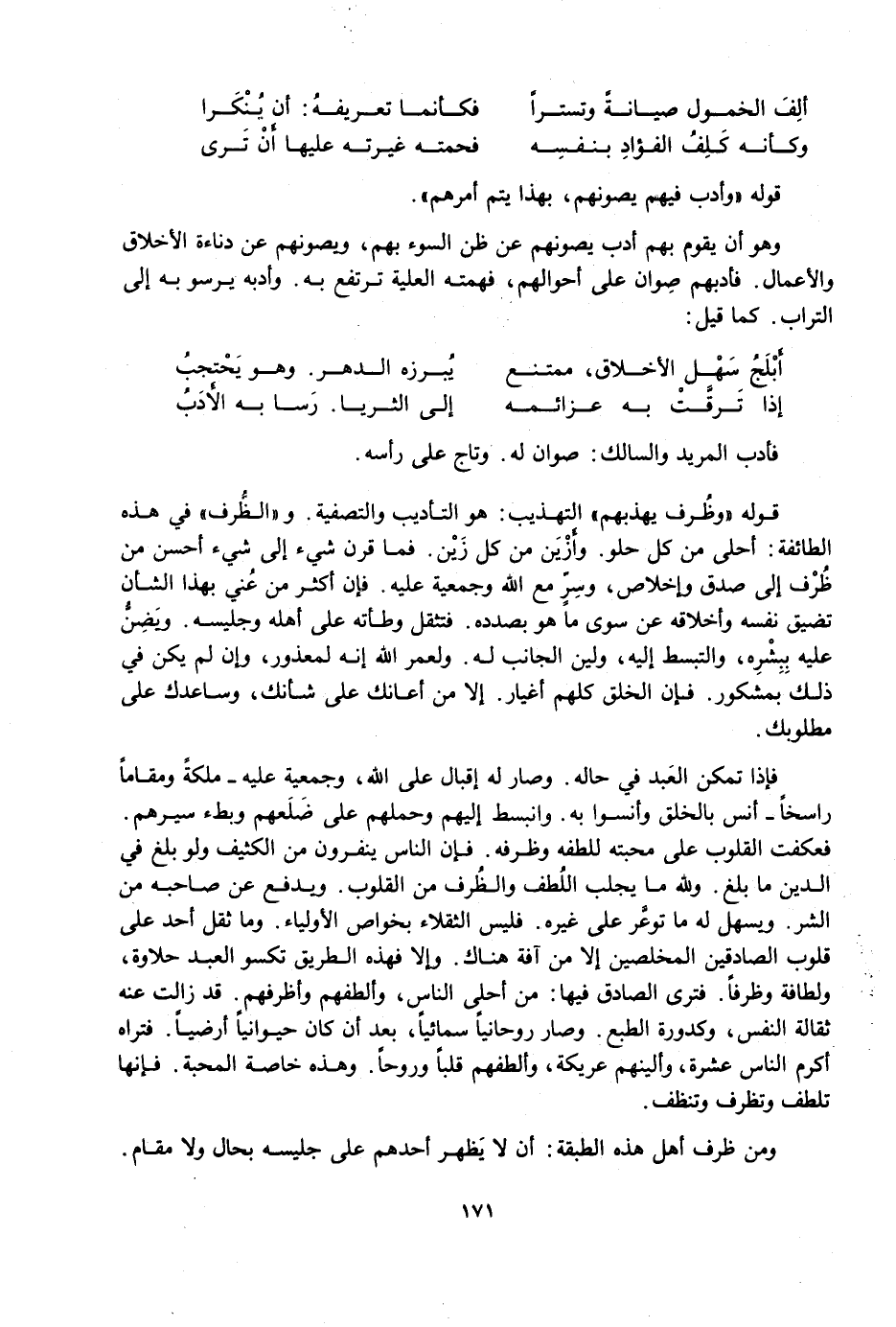 قَوْلُهُ: " وَظَرْفٌ يُهَذِّبُهُمْ " التَّهْذِيبُ: هُوَ التَّأْدِيبُ وَالتَّصْفِيَةُ. وَ " الظَّرْفُ " فِي هَذِهِ الطَّائِفَةِ: أَحْلَى مِنْ كُلِّ حُلْوٍ. وَأَزْيَنُ مِنْ كُلِّ زَيْنٍ. فَمَا قُرِنَ شَيْءٌ إِلَى شَيْءٍ أَحْسَنُ مِنْ ظَرْفٍ إِلَى صِدْقٍ وَإِخْلَاصٍ، وَسِرٍّ مَعَ اللَّهِ وَجَمْعِيَّةٍ عَلَيْهِ، فَإِنَّ أَكْثَرَ مَنْ عُنِيَ بِهَذَا الشَّأْنِ تَضِيقُ نَفْسُهُ وَأَخْلَاقُهُ عَنْ سِوَى مَا هُوَ بِصَدَدِهِ، فَتَثْقُلُ وَطْأَتُهُ عَلَى أَهْلِهِ وَجَلِيسِهِ، وَيَضْمَنُ عَلَيْهِ بِبِشْرِهِ، وَالتَّبَسُّطِ إِلَيْهِ، وَلِينِ الْجَانِبِ لَهُ. وَلَعَمْرُ اللَّهِ إِنَّهُ لَمَعْذُورٌ، وَإِنْ لَمْ يَكُنْ فِي ذَلِكَ بِمَشْكُورٍ، فَإِنَّ الْخَلْقَ كُلَّهُمْ أَغْيَارٌ، إِلَّا مَنْ أَعَانَكَ عَلَى شَأْنِكَ وَسَاعَدَكَ عَلَى مَطْلُوبِكَ.