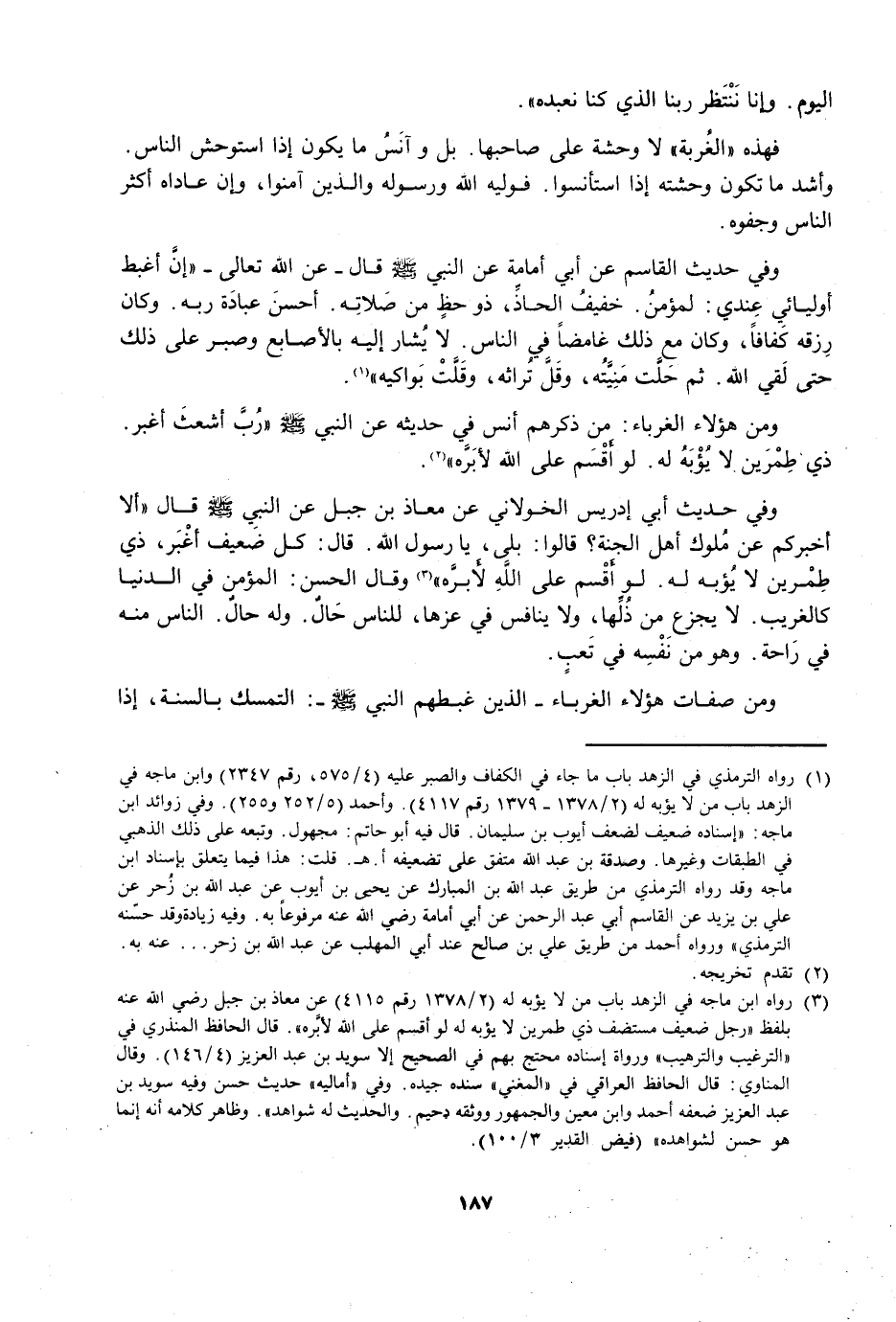 وَمِنْ هَؤُلَاءِ الْغُرَبَاءِ: مَنْ ذَكَرَهُمْ أَنَسٌ فِي حَدِيثِهِ عَنِ النَّبِيِّ صَلَّى اللَّهُ عَلَيْهِ وَسَلَّمَ: «رُبَّ أَشْعَثَ أَغْبَرَ، ذِي طِمْرَيْنِ لَا يُؤْبَهُ لَهُ، لَوْ أَقْسَمَ عَلَى اللَّهِ لَأَبَرَّهُ» .