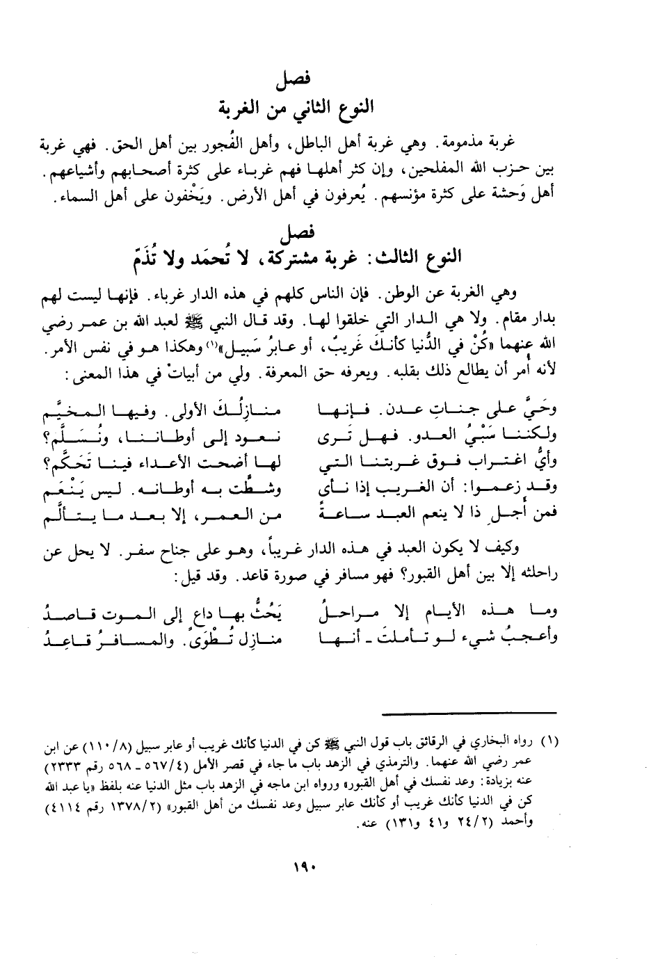 وَهِيَ الْغُرْبَةُ عَنِ الْوَطَنِ؛ فَإِنَّ النَّاسَ كُلَّهُمْ فِي هَذِهِ الدَّارِ غُرَبَاءُ، فَإِنَّهَا لَيْسَتْ لَهُمْ بِدَارِ مَقَامٍ، وَلَا هِيَ الدَّارُ الَّتِي خُلِقُوا لَهَا، وَقَدْ قَالَ النَّبِيُّ صَلَّى اللَّهُ عَلَيْهِ وَسَلَّمَ لِعَبْدِ اللَّهِ بْنِ عُمَرَ رَضِيَ اللَّهُ عَنْهُمَا: «كُنْ فِي الدُّنْيَا كَأَنَّكَ غَرِيبٌ أَوْ عَابِرُ سَبِيلٍ» . وَهَكَذَا هُوَ فِي نَفْسِ الْأَمْرِ؛ لِأَنَّهُ أُمِرَ أَنْ يُطَالِعَ ذَلِكَ بِقَلْبِهِ وَيَعْرِفَهُ حَقَّ الْمَعْرِفَةِ، وَلِي مِنْ أَبْيَاتٍ فِي هَذَا الْمَعْنَى: