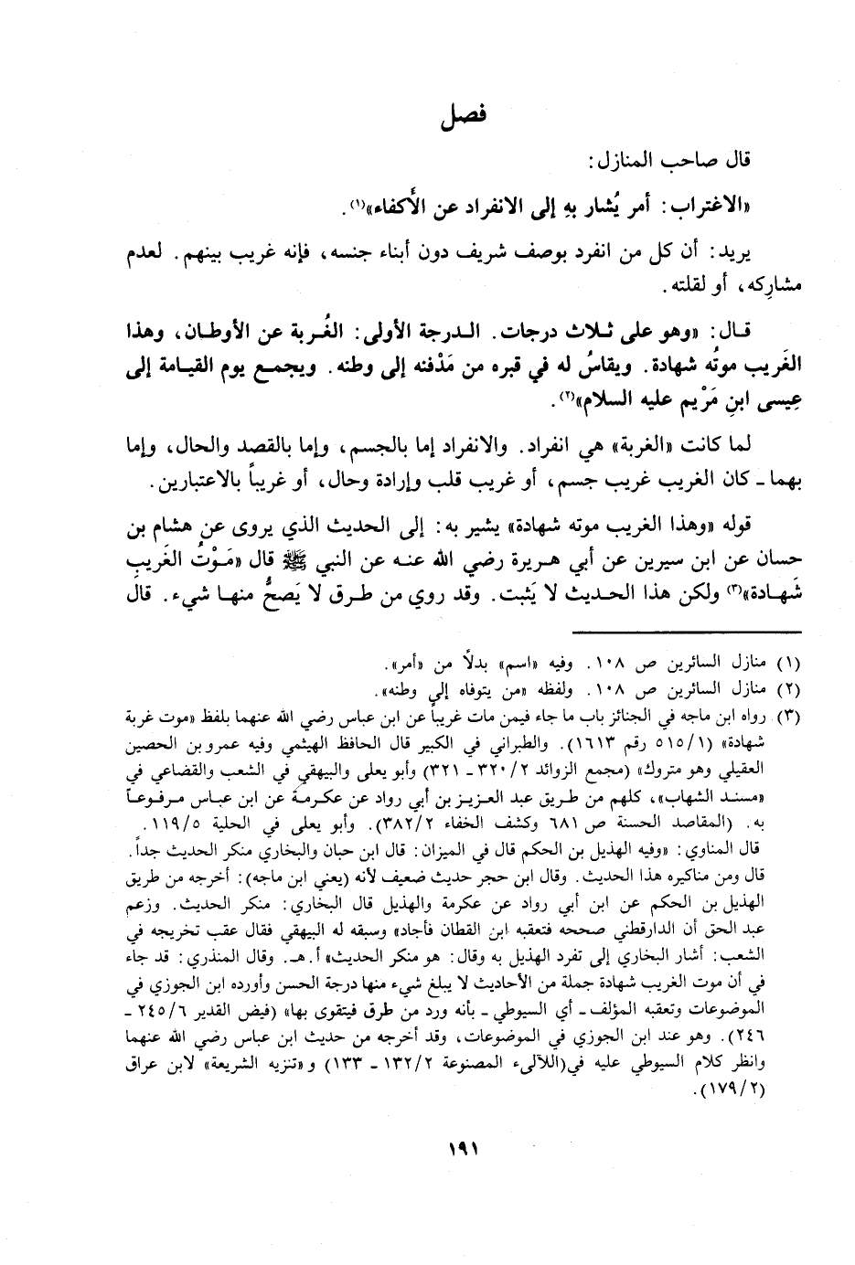 قَالَ: وَهُوَ عَلَى ثَلَاثِ دَرَجَاتٍ؛ الدَّرَجَةُ الْأُولَى: الْغُرْبَةُ عَنِ الْأَوْطَانِ، وَهَذَا الْغَرِيبُ مَوْتُهُ شَهَادَةٌ، وَيُقَاسُ لَهُ فِي قَبْرِهِ مِنْ مَدْفَنِهِ إِلَى وَطَنِهِ، وَيُجْمَعُ يَوْمَ الْقِيَامَةِ إِلَى عِيسَى ابْنِ مَرْيَمَ عَلَيْهِ السَّلَامُ.