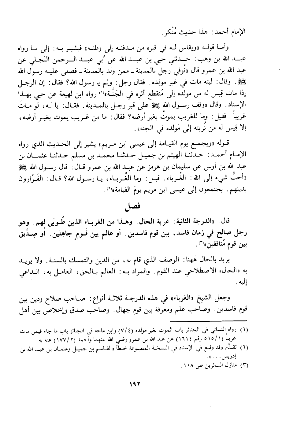 وَجَعَلَ الشَّيْخُ الْغُرَبَاءَ فِي هَذِهِ الدَّرَجَةِ ثَلَاثَةَ أَنْوَاعٍ: صَاحِبَ صَلَاحٍ وَدِينٍ بَيْنَ قَوْمٍ فَاسِدِينَ، وَصَاحِبَ عِلْمٍ وَمَعْرِفَةٍ بَيْنَ قَوْمٍ جُهَّالٍ، وَصَاحِبَ صِدْقٍ وَإِخْلَاصٍ بَيْنَ أَهْلِ