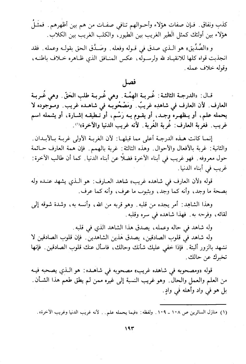 إِنَّمَا كَانَتْ هَذِهِ الدَّرَجَةُ أَعْلَى مِمَّا قَبْلَهَا؛ لِأَنَّ الْغُرْبَةَ الْأُولَى غُرْبَةٌ بِالْأَبْدَانِ. وَالثَّانِيَةَ: غُرْبَةٌ بِالْأَفْعَالِ وَالْأَحْوَالِ. وَهَذِهِ الثَّالِثَةَ: غُرْبَةٌ بِالْهِمَمِ. فَإِنَّ هِمَّةَ الْعَارِفِ حَائِمَةٌ حَوْلَ مَعْرُوفِهِ، فَهُوَ غَرِيبٌ فِي أَبْنَاءِ الْآخِرَةِ، فَضْلًا عَنْ أَبْنَاءِ الدُّنْيَا، كَمَا أَنَّ طَالِبَ الْآخِرَةِ غَرِيبٌ فِي أَبْنَاءِ الدُّنْيَا.