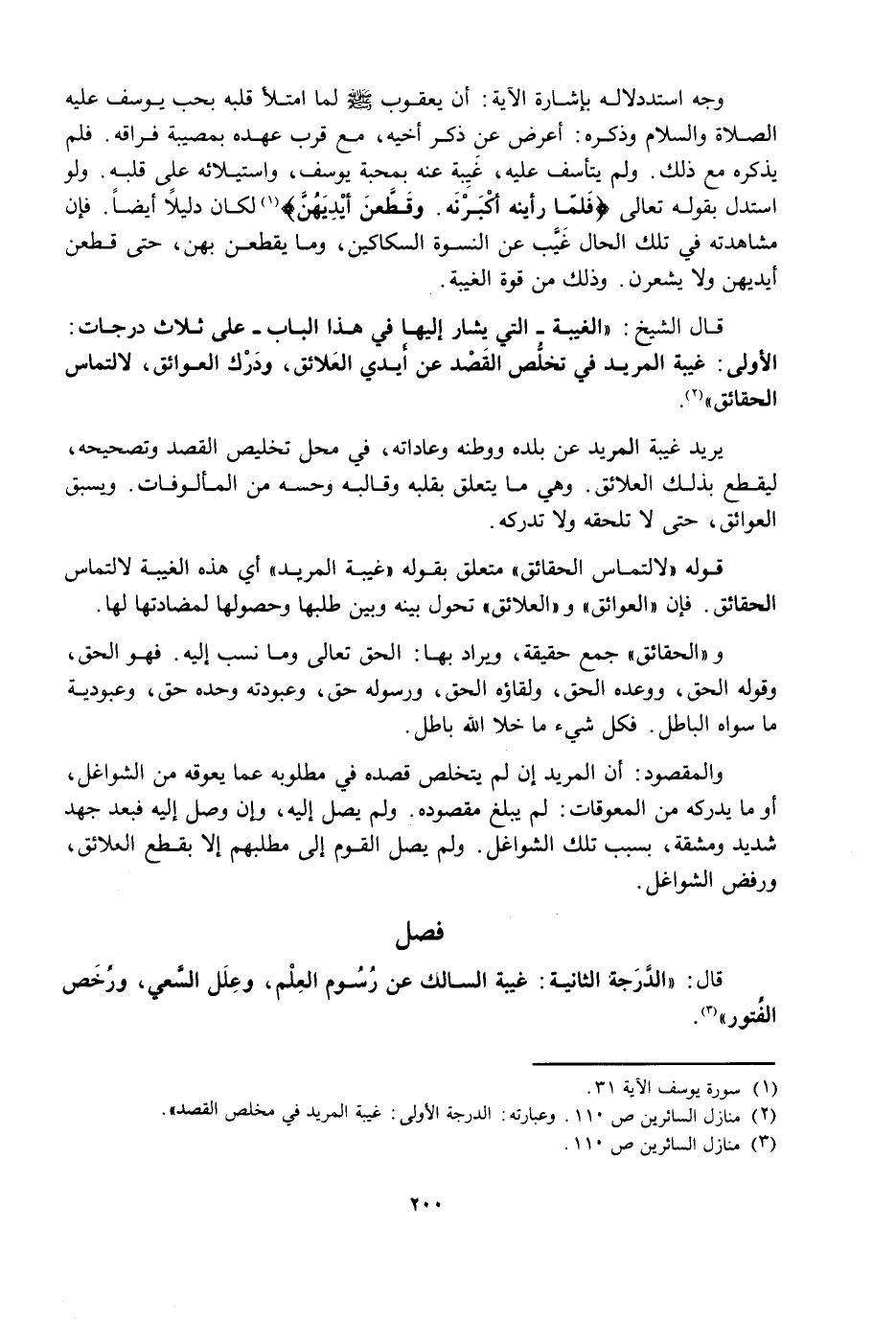 قَالَ الشَّيْخُ: الْغَيْبَةُ الَّتِي يُشَارُ إِلَيْهَا فِي هَذَا الْبَابِ عَلَى ثَلَاثِ دَرَجَاتٍ؛ الْأُولَى: غَيْبَةُ الْمُرِيدِ فِي تَخَلُّصِ الْقَصْدِ عَنْ أَيْدِي الْعَلَائِقِ، وَدَرْكِ الْعَوَائِقِ لِالْتِمَاسِ الْحَقَائِقِ.