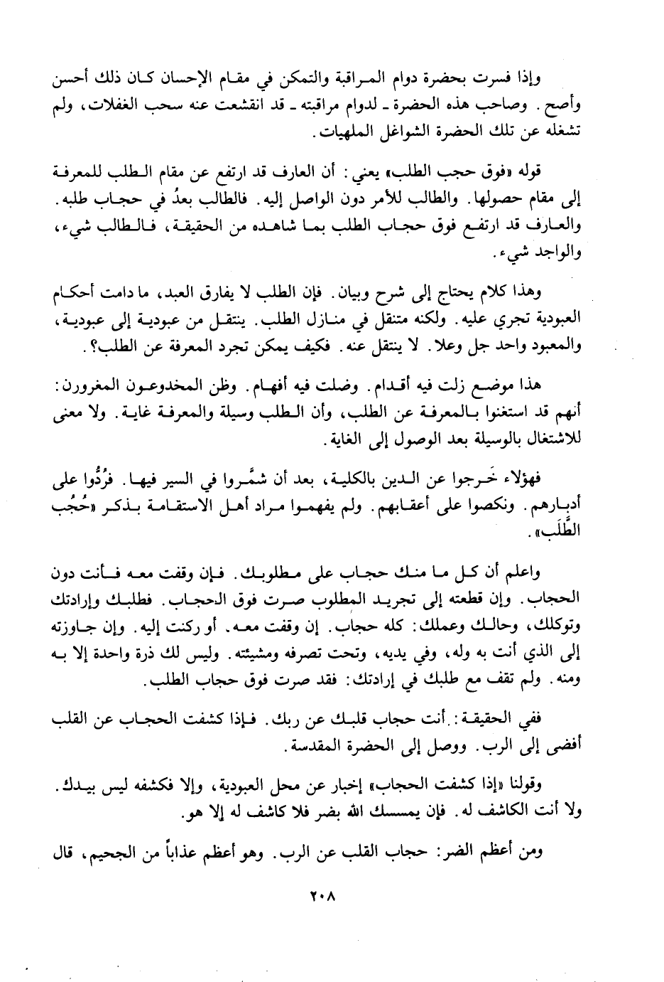 وَاعْلَمْ أَنَّ كُلَّ مَا مِنْكَ حِجَابٌ عَلَى مَطْلُوبِكَ، فَإِنْ وَقَفْتَ مَعَهُ فَأَنْتَ دُونَ الْحِجَابِ، وَإِنْ قَطَعْتَهُ إِلَى تَجْرِيدِ الْمَطْلُوبِ صِرْتَ فَوْقَ الْحِجَابِ، فَطَلَبُكَ وَإِرَادَتُكَ وَتَوَكُّلُكَ، وَحَالُكُ وَعَمَلُكَ كُلُّهُ حِجَابٌ، إِنْ وَقَفْتَ مَعَهُ أَوْ رَكَنْتَ إِلَيْهِ، وَإِنْ جَاوَزْتَهُ إِلَى الَّذِي أَنْتَ بِهِ وَلَهُ وَفِي يَدَيْهِ وَتَحْتَ تَصَرُّفِهِ وَمَشِيئَتِهِ، وَلَيْسَ لَكَ ذَرَّةٌ وَاحِدَةٌ إِلَّا بِهِ وَمِنْهُ، وَلَمْ تَقِفْ مَعَ طَلَبِكَ فِي إِرَادَتِكَ فَقَدْ صِرْتَ فَوْقَ حِجَابِ الطَّلَبِ.