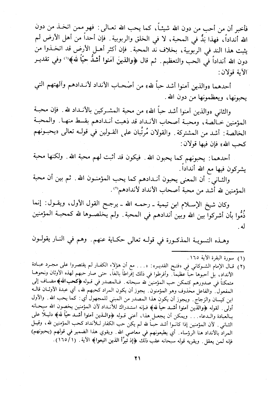 فَأَخْبَرَ أَنَّ مَنْ أَحَبَّ مَنْ دُونِ اللَّهِ شَيْئًا، كَمَا يُحِبُّ اللَّهُ تَعَالَى: فَهُوَ مِمَّنِ اتَّخَذَ مِنْ دُونِ اللَّهِ أَنْدَادًا، فَهَذَا نِدٌّ فِي الْمَحَبَّةِ، لَا فِي الْخَلْقِ وَالرُّبُوبِيَّةِ. فَإِنَّ أَحَدًا مِنْ أَهْلِ الْأَرْضِ لَمْ يُثْبِتْ هَذَا النِّدَّ فِي الرُّبُوبِيَّةِ، بِخِلَافِ نِدِّ الْمَحَبَّةِ. فَإِنَّ أَكْثَرَ أَهْلِ الْأَرْضِ قَدِ اتَّخَذُوا مِنْ دُونِ اللَّهِ أَنْدَادًا فِي الْحُبِّ وَالتَّعْظِيمِ. ثُمَّ قَالَ {وَالَّذِينَ آمَنُوا أَشَدُّ حُبًّا لِلَّهِ} [البقرة: 165] وَفِي تَقْدِيرِ الْآيَةِ قَوْلَانِ: