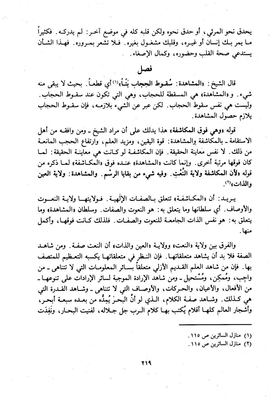 قَوْلُهُ: " وَهِيَ فَوْقَ الْمُكَاشَفَةِ " هَذَا يَدُلُّكَ عَلَى أَنَّ مُرَادَ الشَّيْخِ وَمَنْ وَافَقَهُ مِنْ أَهْلِ الِاسْتِقَامَةِ بِالْمُكَاشَفَةِ وَالْمُشَاهَدَةِ قُوَّةُ الْيَقِينِ، وَمَزِيدُ الْعِلْمِ، وَارْتِفَاعُ الْحُجُبِ الْمَانِعَةِ مِنْ ذَلِكَ، لَا نَفْسُ مُعَايَنَةِ الْحَقِيقَةِ، فَإِنَّ الْمُكَاشَفَةَ لَوْ كَانَتْ هِيَ مُعَايَنَةُ الْحَقِيقَةِ، لَمَا كَانَ فَوْقَهَا مَرْتَبَةٌ أُخْرَى، وَإِنَّمَا كَانَتِ الْمُشَاهَدَةُ عِنْدَهُ فَوْقَ الْمُكَاشَفَةِ لِمَا ذَكَرَهُ مِنْ قَوْلِهِ؛ لِأَنَّ الْمُكَاشَفَةَ وِلَايَةُ النَّعْتِ، وَفِيهِ شَيْءٌ مِنْ بَقَايَا الرَّسْمِ، وَالْمُشَاهَدَةَ وِلَايَةُ الْعَيْنِ وَالذَّاتِ.