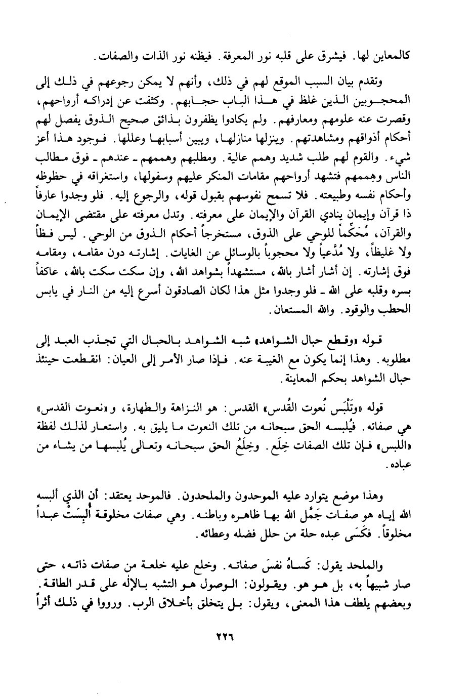 وَهَذَا مَوْضِعٌ يَتَوَارَدُ عَلَيْهِ الْمُوَحِّدُونَ وَالْمُلْحِدُونَ، فَالْمُوَحِّدُ يَعْتَقِدُ: أَنَّ الَّذِي أَلْبَسَهُ اللَّهُ إِيَّاهُ هُوَ صِفَاتٌ جَمَّلَ اللَّهُ بِهَا ظَاهِرَهُ وَبَاطِنَهُ، وَهِيَ صِفَاتٌ مَخْلُوقَةٌ أُلْبِسَتْ عَبْدًا مَخْلُوقًا، فَكَسَا عَبْدَهُ حُلَّةً مِنْ حُلَلِ فَضْلِهِ وَعَطَائِهِ.
