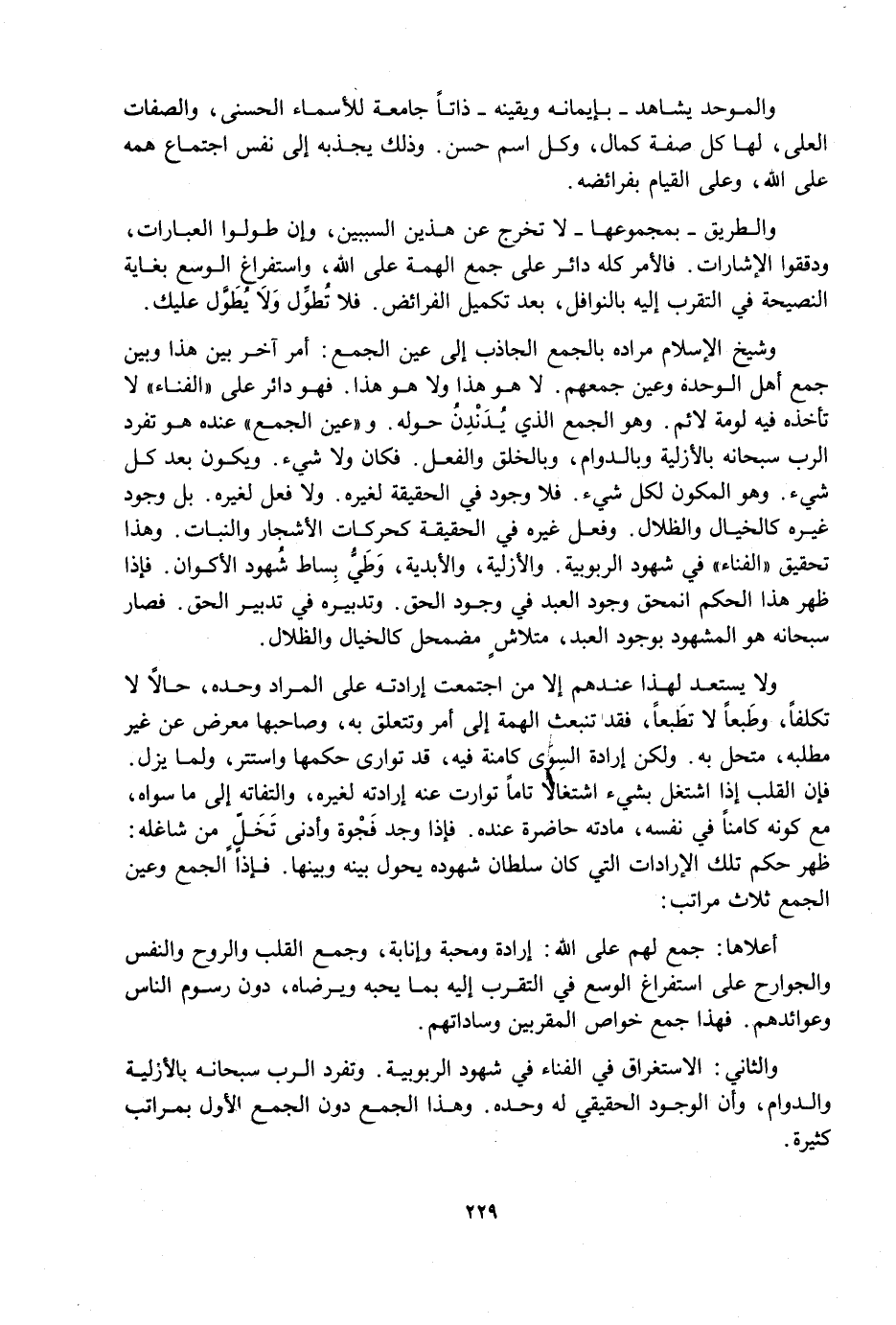 وَالْمُوَحِّدُ يُشَاهِدُ بِإِيمَانِهِ وَيَقِينِهِ ذَاتًا جَامِعَةً لِلْأَسْمَاءِ الْحُسْنَى، وَالصِّفَاتِ الْعُلَى، لَهَا كُلُّ صِفَةِ كَمَالٍ، وَكُلُّ اسْمٍ حَسَنٍ، وَذَلِكَ يَجْذِبُهُ إِلَى نَفْسِ اجْتِمَاعِ هَمِّهِ عَلَى اللَّهِ، وَعَلَى الْقِيَامِ بِفَرَائِضِهِ.