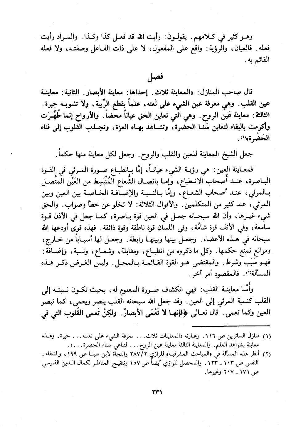 فَمُعَايَنَةُ الْعَيْنِ: هِيَ رُؤْيَةُ الشَّيْءِ عِيَانًا، إِمَّا بِانْطِبَاعِ صُورَةِ الْمَرْئِيِّ فِي الْقُوَّةِ الْبَاصِرَةِ، عِنْدَ أَصْحَابِ الِانْطِبَاعِ، وَإِمَّا بِاتِّصَالِ الشُّعَاعِ الْمُنْبَسِطِ مِنَ الْعَيْنِ الْمُتَّصِلِ بِالْمَرْئِيِّ، عِنْدَ أَصْحَابِ الشُّعَاعِ، وَإِمَّا بِالنِّسْبَةِ وَالْإِضَافَةِ الْخَاصَّةِ بَيْنَ الْعَيْنِ وَبَيْنَ الْمَرْئِيِّ، عِنْدَ كَثِيرٍ مِنَ الْمُتَكَلِّمِينَ، وَالْأَقْوَالُ الثَّلَاثَةُ لَا تَخْلُو عَنْ خَطَأٍ وَصَوَابٍ، وَالْحَقُّ شَيْءٌ غَيْرُهَا، وَأَنَّ اللَّهَ سُبْحَانَهُ جَعَلَ فِي الْعَيْنِ قُوَّةً بَاصِرَةً، كَمَا جَعَلَ فِي الْأُذُنِ قُوَّةً سَامِعَةً، وَفِي الْأَنْفِ قُوَّةً شَامَّةً، وَفِي اللِّسَانِ قُوَّةً نَاطِقَةً وَقُوَّةً ذَائِقَةً، فَهَذِهِ قُوًى أَوْدَعَهَا اللَّهُ سُبْحَانَهُ فِي هَذِهِ الْأَعْضَاءِ، وَجَعَلَ بَيْنَهَا وَبَيْنَهَا رَابِطَةً، وَجَعَلَ لَهَا أَسْبَابًا مِنْ خَارِجٍ، وَمَوَانِعَ تَمْنَعُ حُكْمَهَا، وَكُلُّ مَا ذَكَرُوهُ مِنَ انْطِبَاعٍ، وَمُقَابَلَةٍ، وَشُعَاعٍ، وَنِسْبَةٍ، وَإِضَافَةٍ: فَهُوَ سَبَبٌ وَشَرْطٌ، وَالْمُقْتَضَى هُوَ الْقُوَّةُ الْقَائِمَةُ بِالْمَحَلِّ، وَلَيْسَ الْغَرَضُ ذِكْرَ هَذِهِ الْمَسْأَلَةِ، فَالْمَقْصُودُ أَمْرٌ آخَرُ.