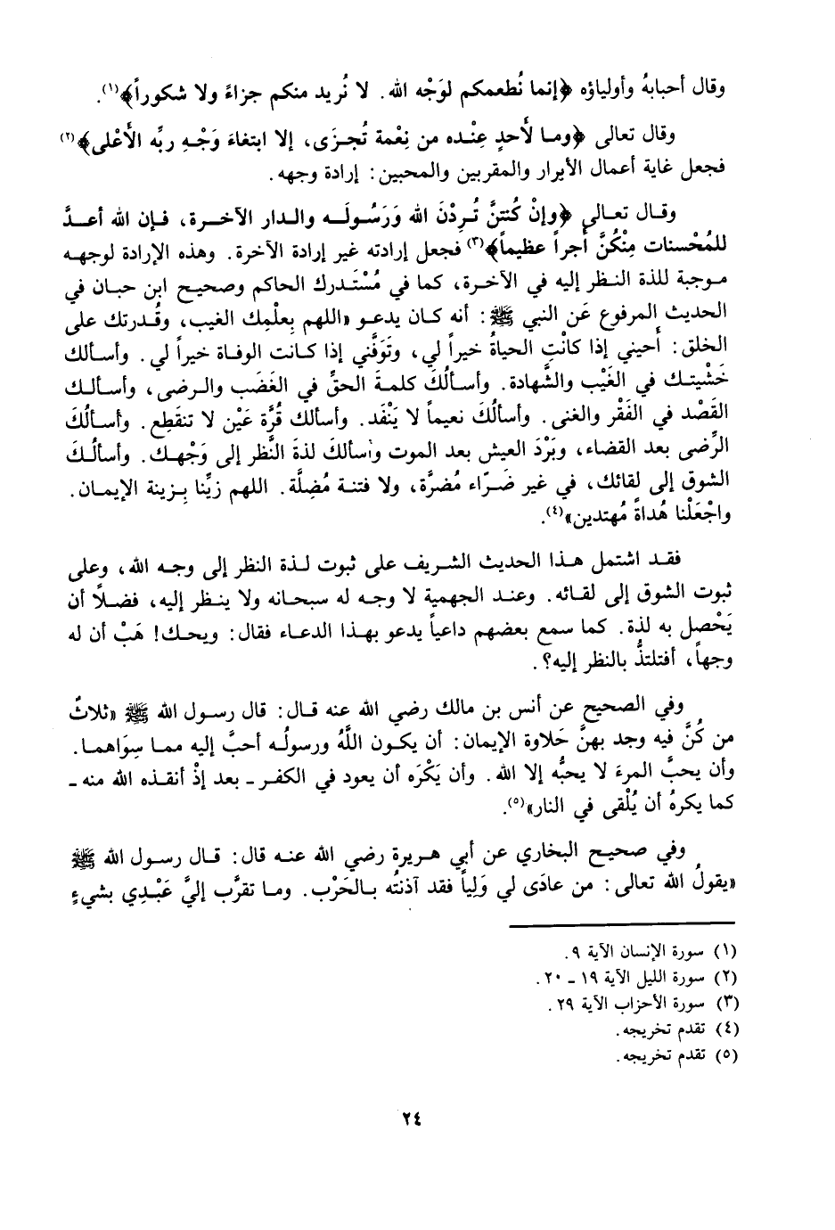وَهَذِهِ الْإِرَادَةُ لِوَجْهِهِ مُوجِبَةٌ لِلَذَّةِ النَّظَرِ إِلَيْهِ فِي الْآخِرَةِ، كَمَا فِي مُسْتَدْرَكِ الْحَاكِمِ وَصَحِيحِ ابْنِ حِبَّانَ فِي الْحَدِيثِ الْمَرْفُوعِ عَنِ «النَّبِيِّ - صَلَّى اللَّهُ عَلَيْهِ وَسَلَّمَ -: أَنَّهُ كَانَ يَدْعُو: اللَّهُمَّ بِعِلْمِكَ الْغَيْبَ، وَقُدْرَتِكَ عَلَى الْخَلْقِ: أَحْيِنِي إِذَا كَانَتِ الْحَيَاةُ خَيْرًا لِي، وَتَوَفَّنِي إِذَا كَانَتِ الْوَفَاةُ خَيْرًا لِي. وَأَسْأَلُكَ خَشْيَتَكَ فِي الْغَيْبِ وَالشَّهَادَةِ. وَأَسْأَلُكَ كَلِمَةَ الْحَقِّ فِي الْغَضَبِ وَالرِّضَا. وَأَسْأَلُكَ الْقَصْدَ فِي الْفَقْرِ وَالْغِنَى. وَأَسْأَلُكَ نَعِيمًا لَا يَنْفَدُ. وَأَسْأَلُكَ قُرَّةَ عَيْنٍ لَا تَنْقَطِعُ. وَأَسْأَلُكَ الرِّضَا بَعْدَ الْقَضَاءِ، وَبَرْدَ الْعَيْشِ بَعْدَ الْمَوْتِ، وَأَسْأَلُكَ لَذَّةَ النَّظَرِ إِلَى وَجْهِكَ. وَأَسْأَلُكَ الشَّوْقَ إِلَى لِقَائِكَ، فِي غَيْرِ ضَرَّاءَ مُضِرَّةٍ، وَلَا فِتْنَةٍ مُضِلَّةٍ. اللَّهُمَّ زَيِّنَّا بِزِينَةِ الْإِيمَانِ. وَاجْعَلْنَا هُدَاةً مُهْتَدِينَ» .