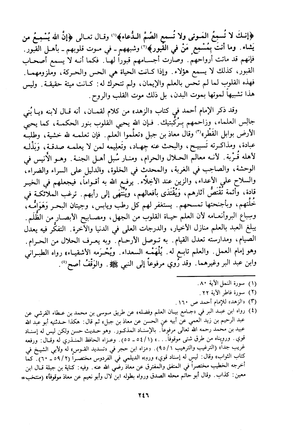 وَقَدْ ذَكَرَ الْإِمَامُ أَحْمَدُ فِي كِتَابِ الزُّهْدِ مِنْ كَلَامِ لُقْمَانَ، أَنَّهُ قَالَ لِابْنِهِ: يَا بُنَيَّ جَالِسِ الْعُلَمَاءَ، وَزَاحِمْهُمْ بِرُكْبَتَيْكَ، فَإِنَّ اللَّهَ يُحْيِي الْقُلُوبَ بِنُورِ الْحِكْمَةِ، كَمَا يُحْيِي الْأَرْضَ بِوَابِلِ الْقَطْرِ، وَقَالَ مُعَاذُ بْنُ جَبَلٍ تَعَلَّمُوا الْعِلْمَ، فَإِنَّ تَعَلُّمَهُ لِلَّهِ خَشْيَةٌ، وَطَلَبَهُ عِبَادَةٌ، وَمُذَاكَرَتَهٌ تَسْبِيحٌ، وَالْبَحْثَ عَنْهُ جِهَادٌ، وَتَعْلِيمَهُ لِمَنْ لَا يَعْلَمُهُ صَدَقَةٌ، وَبَذْلَهُ لِأَهْلِهِ قُرْبَةٌ؛ لِأَنَّهُ مَعَالِمُ الْحَلَالِ وَالْحَرَامِ، وَمَنَارُ سُبُلِ أَهْلِ الْجَنَّةِ، وَهُوَ الْأَنِيسُ فِي الْوَحْشَةِ، وَالصَّاحِبُ فِي الْغُرْبَةِ، وَالْمُحَدِّثُ فِي الْخَلْوَةِ، وَالدَّلِيلُ عَلَى السَّرَّاءِ وَالضَّرَّاءِ، وَالسِّلَاحُ عَلَى الْأَعْدَاءِ، وَالزَّيْنُ عِنْدَ الْأَخِلَّاءِ، يَرْفَعُ اللَّهُ بِهِ أَقْوَامًا، فَيَجْعَلُهُمْ فِي الْخَيْرِ قَادَةً، وَأَئِمَّةً تُقْتَصُّ آثَارُهُمْ، وَيُقْتَدَى بِأَفْعَالِهِمْ، وَيُنْتَهَى إِلَى رَأْيِهِمْ، تَرْغَبُ الْمَلَائِكَةُ فِي خُلَّتِهِمْ، وَبِأَجْنِحَتِهَا تَمْسَحُهُمْ، يَسْتَغْفِرُ لَهُمْ كُلُّ رَطْبٍ وَيَابِسٍ، وَحِيتَانُ الْبَحْرِ وَهَوَامُّهُ، وَسِبَاعُ الْبَرِّ وَأَنْعَامُهُ؛ لِأَنَّ الْعِلْمَ حَيَاةُ الْقُلُوبِ مِنَ الْجَهْلِ، وَمَصَابِيحُ الْأَبْصَارِ مِنَ الظُّلَمِ، يَبْلُغُ الْعَبْدُ بِالْعِلْمِ مَنَازِلَ الْأَخْيَارِ، وَالدَّرَجَاتِ الْعُلَى فِي الدُّنْيَا وَالْآخِرَةِ، التَّفَكُّرُ فِيهِ يَعْدِلُ الصِّيَامَ، وَمُدَارَسَتُهُ تَعْدِلُ الْقِيَامَ، بِهِ تُوصَلُ الْأَرْحَامُ، وَبِهِ يُعْرَفُ الْحَلَالُ مِنَ الْحَرَامِ، وَهُوَ إِمَامُ الْعَمَلِ، وَالْعَمَلُ تَابِعٌ لَهُ يُلْهَمُهُ السُّعَدَاءُ، وَيُحْرَمُهُ الْأَشْقِيَاءَ. رَوَاهُ الطَّبَرَانِيُّ وَابْنُ عَبْدِ الْبَرِّ وَغَيْرُهُمَا، وَقَدْ رُوِيَ مَرْفُوعًا إِلَى النَّبِيِّ صَلَّى اللَّهُ عَلَيْهِ وَسَلَّمَ، وَالْوَقْفُ أَصَحُّ.