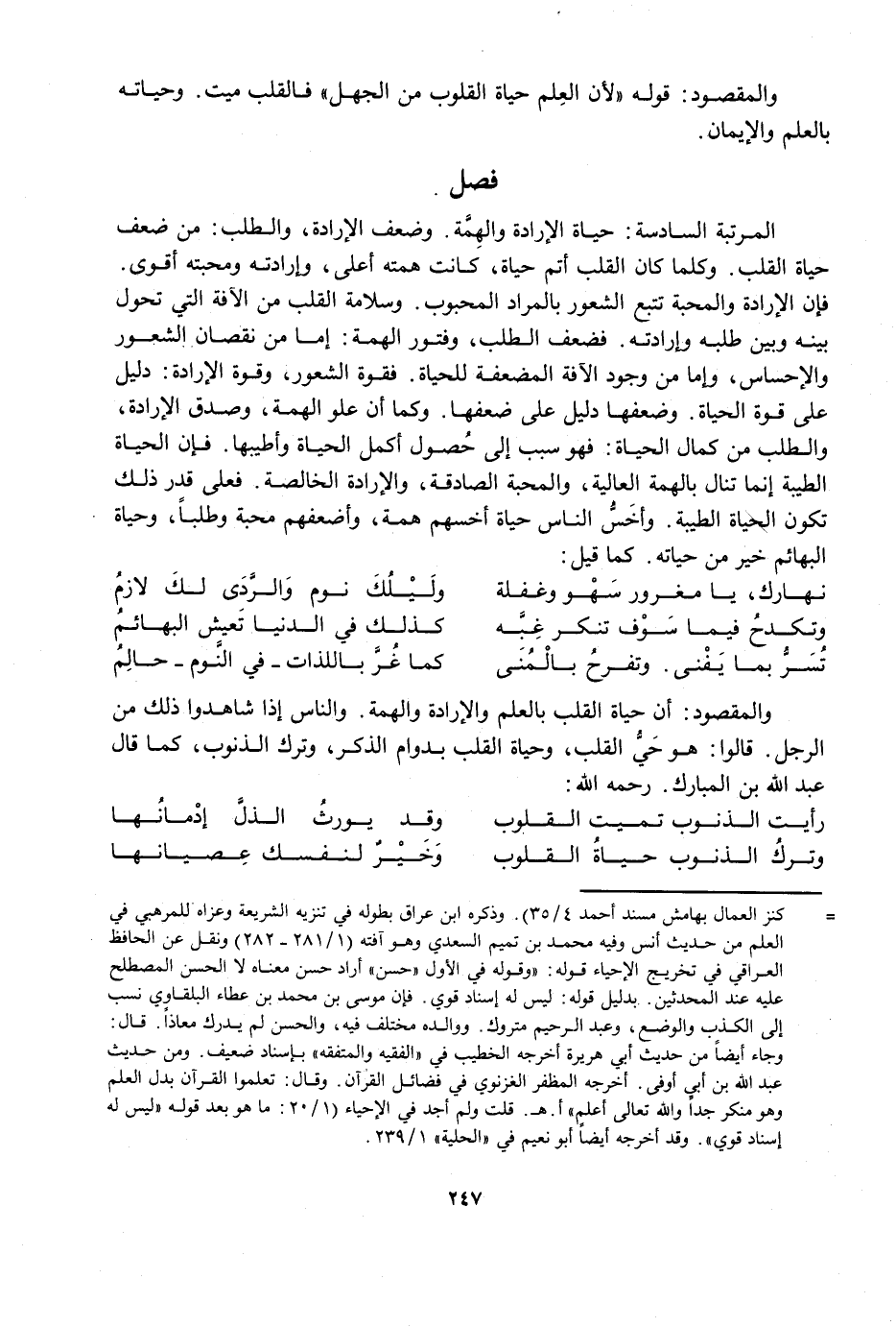 الْمَرْتَبَةُ السَّادِسَةُ: حَيَاةُ الْإِرَادَةِ وَالْهِمَّةِ. وَضَعْفُ الْإِرَادَةِ وَالطَّلَبِ: مِنْ ضَعْفِ حَيَاةِ الْقَلْبِ، وَكُلَّمَا كَانَ الْقَلْبُ أَتَمَّ حَيَاةٍ، كَانَتْ هِمَّتُهُ أَعْلَى وَإِرَادَتُهُ وَمَحَبَّتُهُ أَقْوَى، فَإِنَّ الْإِرَادَةَ وَالْمَحَبَّةَ تَتْبَعُ الشُّعُورَ بِالْمُرَادِ الْمَحْبُوبِ، وَسَلَامَةُ الْقَلْبِ مِنَ الْآفَةِ الَّتِي تَحُولُ بَيْنَهُ وَبَيْنَ طَلَبِهِ وَإِرَادَتِهِ، فَضَعْفُ الطَّلَبِ، وَفُتُورُ الْهِمَّةِ إِمَّا مِنْ نُقْصَانِ الشُّعُورِ وَالْإِحْسَانِ، وَإِمَّا مِنْ وُجُودِ الْآفَةِ الْمُضْعِفَةِ لِلْحَيَاةِ، فَقُوَّةُ الشُّعُورِ، وَقُوَّةُ الْإِرَادَةِ دَلِيلٌ عَلَى قُوَّةِ الْحَيَاةِ، وَضَعْفُهَا دَلِيلٌ عَلَى ضَعْفِهَا، وَكَمَا أَنَّ عُلُوَّ الْهِمَّةِ، وَصِدْقَ الْإِرَادَةِ وَالطَّلَبِ مِنْ كَمَالِ الْحَيَاةِ: فَهُوَ سَبَبٌ إِلَى حُصُولِ أَكْمَلِ الْحَيَاةِ وَأَطْيَبِهَا، فَإِنَّ الْحَيَاةَ الطَّيِّبَةَ إِنَّمَا تُنَالُ بِالْهِمَّةِ الْعَالِيَةِ، وَالْمَحَبَّةِ الصَّادِقَةِ، وَالْإِرَادَةِ الْخَالِصَةِ، فَعَلَى قَدْرِ ذَلِكَ تَكُونُ الْحَيَاةُ الطَّيِّبَةُ، وَأَخَسُّ النَّاسِ حَيَاةً أَخَسُّهُمْ هِمَّةً، وَأَضْعَفُهُمْ مَحَبَّةً وَطَلَبًا، وَحَيَاةُ الْبَهَائِمِ خَيْرٌ مِنْ حَيَاتِهِ. كَمَا قِيلَ: