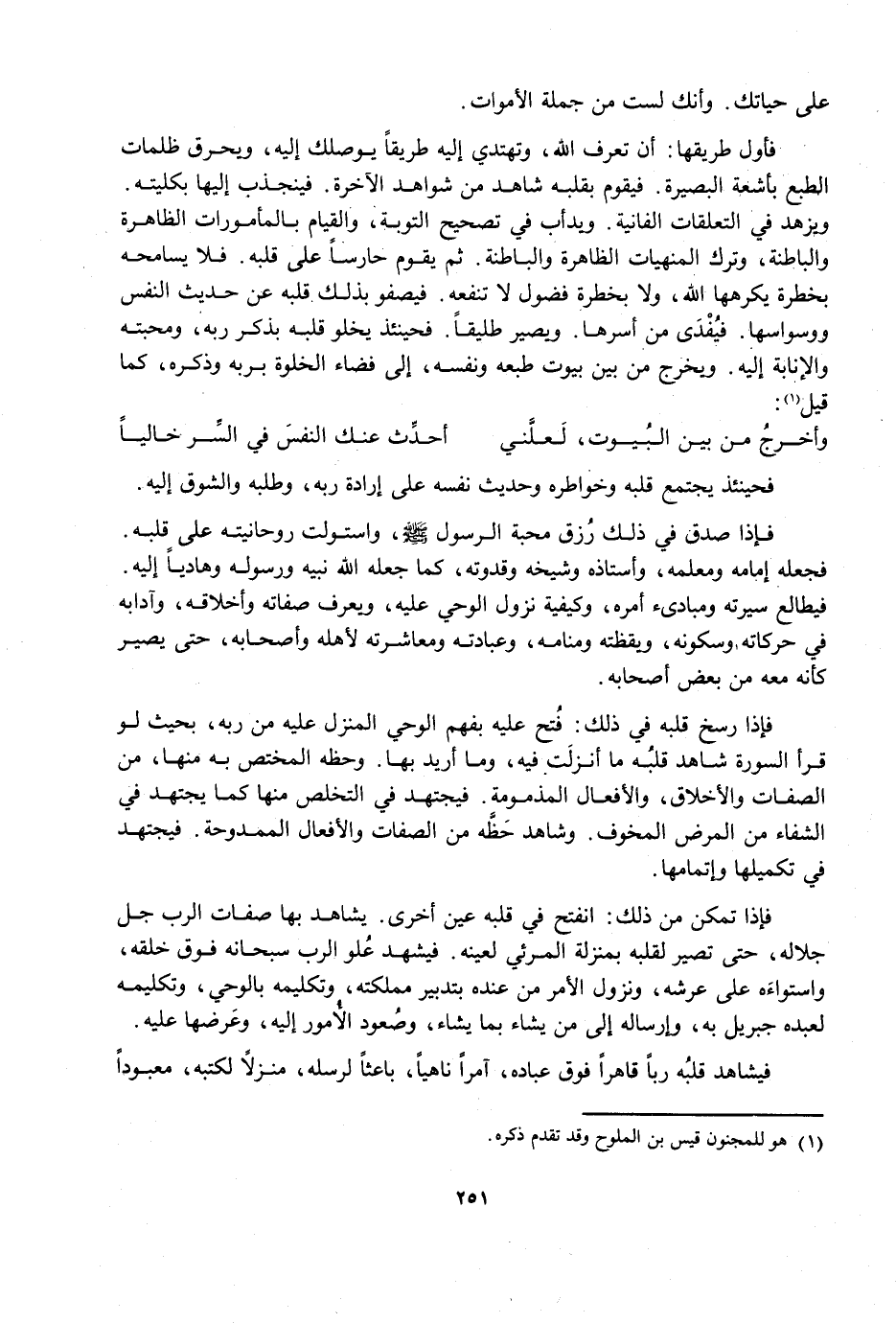 فَأَوَّلُ طَرِيقِهَا: أَنْ تَعْرِفَ اللَّهَ، وَتَهْتَدِيَ إِلَيْهِ طَرِيقًا يُوَصِّلُكَ إِلَيْهِ، وَيُحْرِقُ ظُلُمَاتِ الطَّبْعِ بِأَشِعَّةِ الْبَصِيرَةِ، فَيَقُومُ بِقَلْبِهِ شَاهِدٌ مِنْ شَوَاهِدِ الْآخِرَةِ، فَيَنْجَذِبُ إِلَيْهَا بِكُلِّيَّتِهِ، وَيَزْهَدُ فِي التَّعَلُّقَاتِ الْفَانِيَةِ، وَيَدْأَبُ فِي تَصْحِيحِ التَّوْبَةِ، وَالْقِيَامِ بِالْمَأْمُورَاتِ الظَّاهِرَةِ وَالْبَاطِنَةِ، وَتَرْكِ الْمَنْهِيَّاتِ الظَّاهِرَةِ وَالْبَاطِنَةِ، ثُمَّ يَقُومُ حَارِسًا عَلَى قَلْبِهِ، فَلَا يُسَامِحُهُ بِخَطْرَةٍ يَكْرَهُهَا اللَّهُ، وَلَا بِخَطْرَةِ فُضُولٍ لَا تَنْفَعُهُ، فَيَصْفُو بِذَلِكَ قَلْبُهُ عَنْ حَدِيثِ النَّفْسِ وَوَسْوَاسِهَا، فَيُفْدَى مِنْ أَسْرِهَا، وَيَصِيرُ طَلِيقًا، فَحِينَئِذٍ يَخْلُو قَلْبُهُ بِذِكْرِ رَبِّهِ، وَمَحَبَّتِهِ وَالْإِنَابَةِ إِلَيْهِ، وَيَخْرُجُ مِنْ بَيْنِ بُيُوتِ طَبْعِهِ وَنَفْسِهِ، إِلَى فَضَاءِ الْخُلْوَةِ بِرَبِّهِ وَذِكْرِهِ، كَمَا قِيلَ: