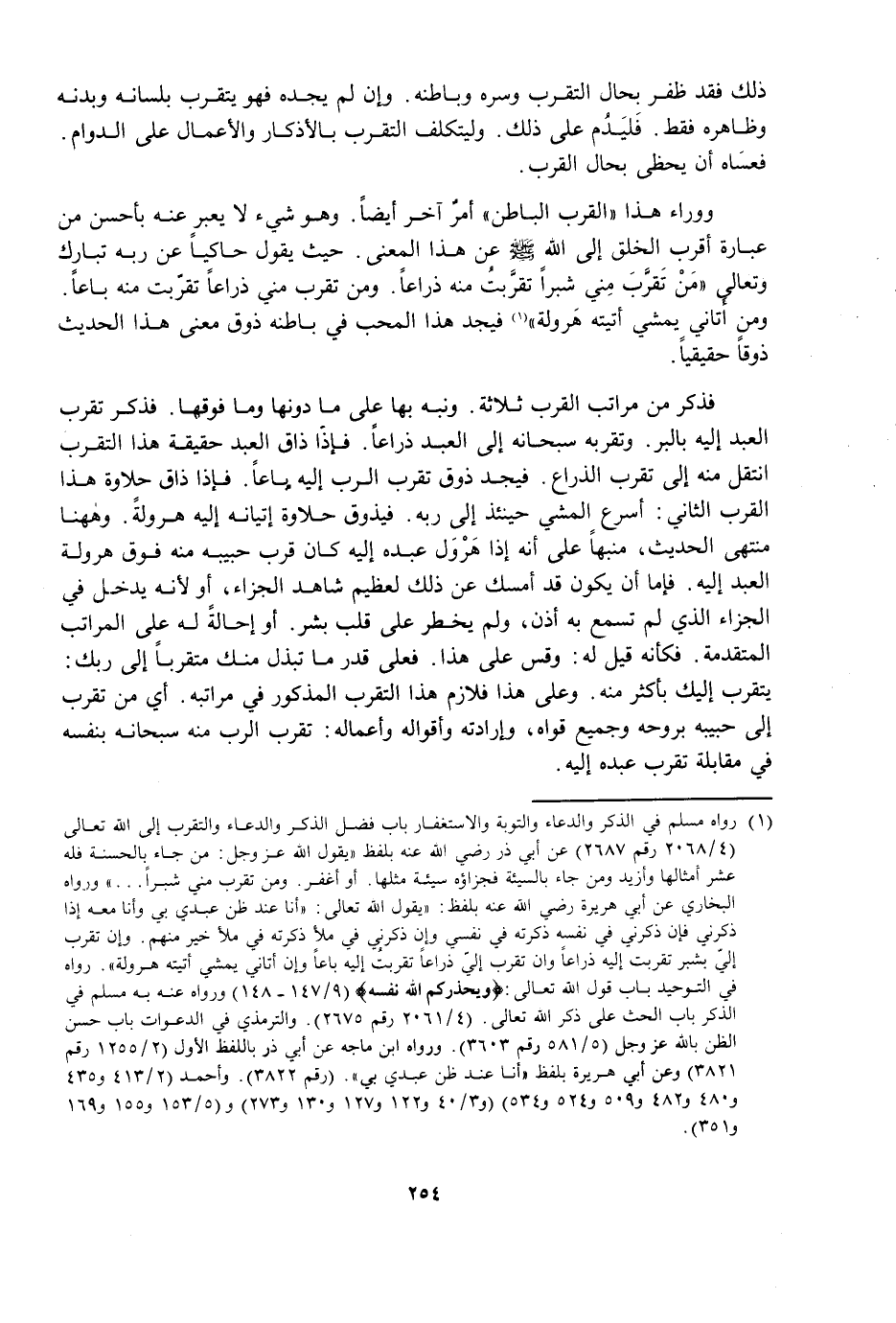 وَوَرَاءَ هَذَا الْقُرْبِ الْبَاطِنِ أَمْرٌ آخَرُ أَيْضًا، وَهُوَ شَيْءٌ لَا يُعَبَّرُ عَنْهُ بِأَحْسَنِ مِنْ عِبَارَةِ أَقْرَبِ الْخَلْقِ إِلَى اللَّهِ صَلَّى اللَّهُ عَلَيْهِ وَسَلَّمَ عَنْ هَذَا الْمَعْنَى، حَيْثُ يَقُولُ حَاكِيًا عَنْ رَبِّهِ تَبَارَكَ وَتَعَالَى: «مَنْ تَقَرَّبَ مِنِّي شِبْرًا تَقَرَّبْتُ مِنْهُ ذِرَاعًا، وَمَنْ تَقَرَّبَ مِنِّي ذِرَاعًا تَقَرَّبْتُ مِنْهُ بَاعًا، وَمَنْ أَتَانِي يَمْشِي أَتَيْتُهُ هَرْوَلَةً» فَيَجِدُ هَذَا الْمُحِبُّ فِي بَاطِنِهِ ذَوْقَ مَعْنَى هَذَا الْحَدِيثِ ذَوْقًا حَقِيقِيًّا.