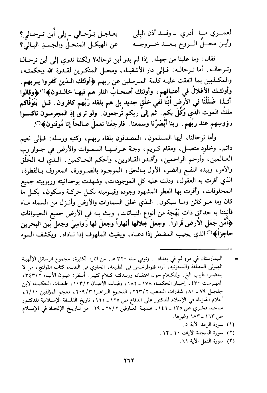 فَقَالَ: وَمَا عَلَيْنَا مِنْ جَهْلِهِ، إِذَا لَمْ يَدْرِ أَيْنَ تِرْحَالُهُ؟ وَلَكِنَّنَا نَدْرِي إِلَى أَيْنَ تِرْحَالُنَا وَتِرْحَالُهُ، أَمَّا تِرْحَالُهُ فَإِلَى دَارِ الْأَشْقِيَاءِ، وَمَحِلِّ الْمُنْكِرِينَ لِقُدْرَةِ اللَّهِ وَحِكْمَتِهِ، وَالْمُكَذِّبِينَ بِمَا اتَّفَقَتْ عَلَيْهِ كَلِمَةُ الْمُرْسَلِينَ عَنْ رَبِّهِمْ {أُولَئِكَ الَّذِينَ كَفَرُوا بِرَبِّهِمْ وَأُولَئِكَ الْأَغْلَالُ فِي أَعْنَاقِهِمْ وَأُولَئِكَ أَصْحَابُ النَّارِ هُمْ فِيهَا خَالِدُونَ - وَقَالُوا أَئِذَا ضَلَلْنَا فِي الْأَرْضِ أَئِنَّا لَفِي خَلْقٍ جَدِيدٍ بَلْ هُمْ بِلِقَاءِ رَبِّهِمْ كَافِرُونَ - قُلْ يَتَوَفَّاكُمْ مَلَكُ الْمَوْتِ الَّذِي وُكِّلَ بِكُمْ ثُمَّ إِلَى رَبِّكُمْ تُرْجَعُونَ - وَلَوْ تَرَى إِذِ الْمُجْرِمُونَ نَاكِسُو رُءُوسِهِمْ عِنْدَ رَبِّهِمْ رَبَّنَا أَبْصَرْنَا وَسَمِعْنَا فَارْجِعْنَا نَعْمَلْ صَالِحًا إِنَّا مُوقِنُونَ} [السجدة: 5 - 12] .