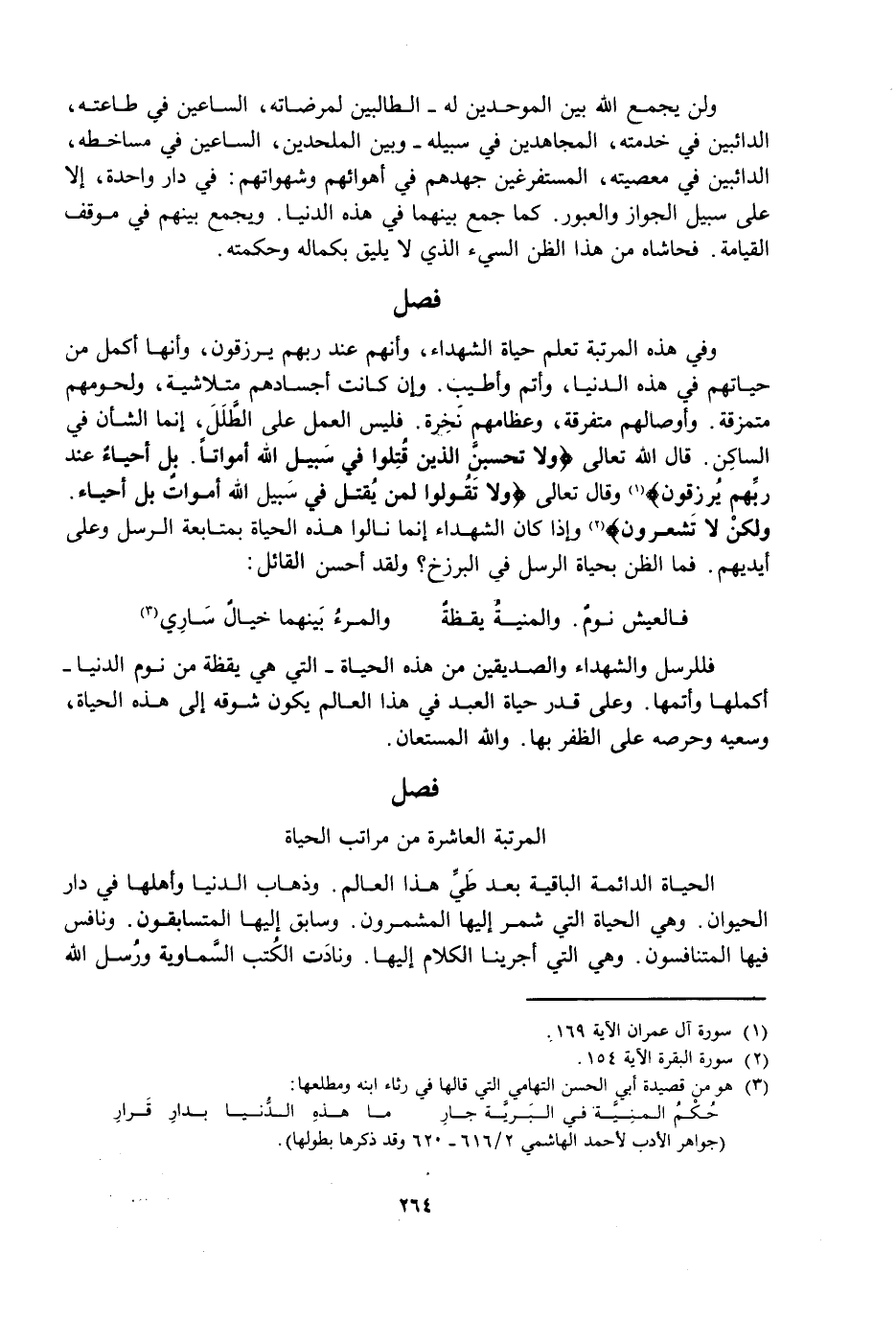 وَفِي هَذِهِ الْمَرْتَبَةِ تُعْلَمُ حَيَاةُ الشُّهَدَاءِ، وَأَنَّهُمْ عِنْدَ رَبِّهِمْ يُرْزَقُونَ، وَأَنَّهَا أَكْمَلُ مِنْ حَيَاتِهِمْ فِي هَذِهِ الدُّنْيَا، وَأَتَمُّ وَأَطْيَبُ، وَإِنْ كَانَتْ أَجْسَادُهُمْ مُتَلَاشِيَةً، وَلُحُومُهُمْ مُتَمَزِّقَةً، وَأَوْصَالُهُمْ مُتَفَرِّقَةً، وَعِظَامُهُمْ نَخِرَةً، فَلَيْسَ الْعَمَلُ عَلَى الطَّلَلِ إِنَّمَا الشَّأْنُ فِي السَّاكِنِ، قَالَ اللَّهُ تَعَالَى: {وَلَا تَحْسَبَنَّ الَّذِينَ قُتِلُوا فِي سَبِيلِ اللَّهِ أَمْوَاتًا بَلْ أَحْيَاءٌ عِنْدَ رَبِّهِمْ يُرْزَقُونَ} [آل عمران: 169] ، وَقَالَ تَعَالَى: {وَلَا تَقُولُوا لِمَنْ يُقْتَلُ فِي سَبِيلِ اللَّهِ أَمْوَاتٌ بَلْ أَحْيَاءٌ وَلَكِنْ لَا تَشْعُرُونَ} [البقرة: 154] وَإِذَا كَانَ الشُّهَدَاءُ إِنَّمَا نَالُوا هَذِهِ الْحَيَاةَ بِمُتَابَعَةِ الرُّسُلِ وَعَلَى أَيْدِيهِمْ، فَمَا الظَّنُّ بِحَيَاةِ الرُّسُلِ فِي الْبَرْزَخِ؟ وَلَقَدْ أَحْسَنَ الْقَائِلُ: