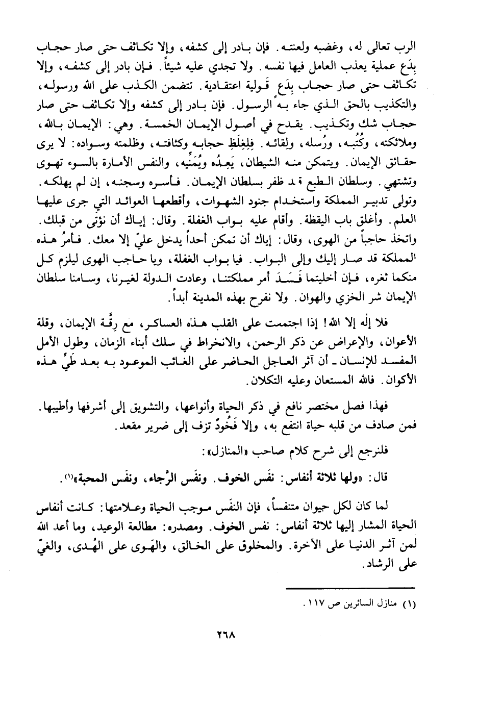 الرَّبِّ تَعَالَى لَهُ وَغَضَبَهُ وَلَعْنَتَهُ، فَإِنْ بَادَرَ إِلَى كَشْفِهِ وَإِلَّا تَكَاثَفَ حَتَّى صَارَ حِجَابَ بِدَعٍ عَمَلِيَّةٍ يُعَذِّبُ الْعَامِلُ فِيهَا نَفْسَهُ، وَلَا تُجْدِي عَلَيْهِ شَيْئًا، فَإِنْ بَادَرَ إِلَى كَشْفِهِ وَإِلَّا تَكَاثَفَ حَتَّى صَارَ حِجَابَ بِدَعٍ قَوْلِيَّةٍ اعْتِقَادِيَّةٍ؛ تَتَضَمَّنُ الْكَذِبَ عَلَى اللَّهِ وَرَسُولِهِ، وَالتَّكْذِيبَ بِالْحَقِّ الَّذِي جَاءَ بِهِ الرَّسُولُ، فَإِنْ بَادَرَ إِلَى كَشْفِهِ وَإِلَّا تَكَاثَفَ حَتَّى صَارَ حِجَابَ شَكٍّ وَتَكْذِيبٍ؛ يَقْدَحُ فِي أُصُولِ الْإِيمَانِ الْخَمْسَةِ، وَهِيَ: الْإِيمَانُ بِاللَّهِ وَمَلَائِكَتِهِ وَكُتُبِهِ وَرُسُلِهِ وَلِقَائِهِ، فَلِغِلَظِ حِجَابِهِ وَكَثَافَتِهِ وَظُلْمَتِهِ وَسَوَادِهِ لَا يَرَى حَقَائِقَ الْإِيمَانِ، وَيَتَمَكَّنُ مِنْهُ الشَّيْطَانُ، يَعِدُهُ وَيُمَنِّيهِ، وَالنَّفْسُ الْأَمَّارَةُ بِالسُّوءِ تَهْوَى وَتَشْتَهِي، وَسُلْطَانُ الطَّبْعِ قَدْ ظَفِرَ بِسُلْطَانِ الْإِيمَانِ، فَأَسَرَهُ وَسَجَنَهُ إِنْ لَمْ يُهْلِكْهُ، وَتَوَلَّى تَدْبِيرَ الْمَمْلَكَةِ وَاسْتِخْدَامَ جُنُودِ الشَّهَوَاتِ، وَأَقْطَعَهَا الْعَوَائِدَ الَّتِي جَرَى عَلَيْهَا الْعَمَلُ، وَأَغْلَقَ بَابَ الْيَقَظَةِ، وَأَقَامَ عَلَيْهِ بَوَّابَ الْغَفْلَةِ، وَقَالَ: إِيَّاكَ أَنْ نُؤْتَى مِنْ قِبَلِكَ، وَاتَّخَذَ حَاجِبًا مِنَ الْهَوَى، وَقَالَ: إِيَّاكَ أَنْ تُمَكِّنَ أَحَدًا يَدْخُلُ عَلَيَّ إِلَّا مَعَكَ، فَأَمْرُ هَذِهِ الْمَمْلَكَةِ قَدْ صَارَ إِلَيْكَ وَإِلَى الْبَوَّابِ، فَيَا بَوَّابَ الْغَفْلَةِ، وَيَا حَاجِبَ الْهَوَى لِيَلْزَمْ كُلٌّ مِنْكُمَا ثَغْرَهُ، فَإِنْ أَخْلَيْتُمَا فَسَدَ أَمْرُ مَمْلَكَتِنَا، وَعَادَتِ الدَّوْلَةُ لِغَيْرِنَا، وَسَامَنَا سُلْطَانُ الْإِيمَانِ شَرَّ الْخِزْيِ وَالْهَوَانِ، وَلَا نَفْرَحُ بِهَذِهِ الْمَدِينَةِ أَبَدًا.