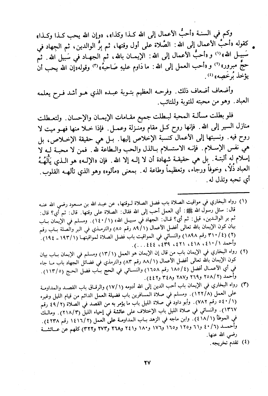 وَكَمْ فِي السُّنَّةِ " أَحَبُّ الْأَعْمَالِ إِلَى اللَّهِ كَذَا وَكَذَا "، وَ " إِنَّ اللَّهَ يُحِبُّ كَذَا وَكَذَا " كَقَوْلِهِ «أَحَبُّ الْأَعْمَالِ إِلَى اللَّهِ: الصَّلَاةُ عَلَى وَقْتِهَا، ثُمَّ بِرُّ الْوَالِدَيْنِ، ثُمَّ الْجِهَادُ فِي سَبِيلِ اللَّهِ» وَ «أَحَبُّ الْأَعْمَالِ إِلَى اللَّهِ: الْإِيمَانُ بِاللَّهِ، ثُمَّ الْجِهَادُ فِي سَبِيلِ اللَّهِ. ثُمَّ حَجٌّ مَبْرُورٌ» وَ «أَحَبُّ الْعَمَلِ إِلَى اللَّهِ: مَا دَاوَمَ عَلَيْهِ صَاحِبُهُ» وَقَوْلِهِ «إِنَّ اللَّهَ يُحِبُّ أَنْ يُؤْخَذَ بِرُخَصِهِ» .
