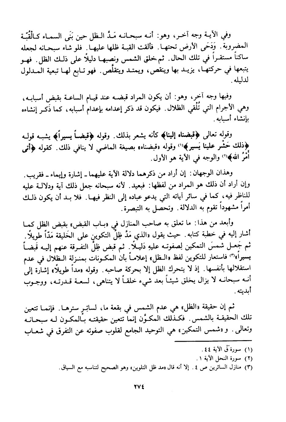 وَأَبْعَدُ مِنْ هَذَا مَا تَعَلَّقَ بِهِ صَاحِبُ الْمَنَازِلِ فِي بَابِ الْقَبْضِ بِقَبْضِ الظِّلِّ كَمَا أَشَارَ إِلَيْهِ فِي خُطْبَةِ كِتَابِهِ، حَيْثُ يَقُولُ: الَّذِي مَدَّ ظِلَّ التَّكْوِينِ عَلَى الْخَلِيقَةِ مَدًّا طَوِيلًا، ثُمَّ جَعَلَ شَمْسَ التَّمْكِينِ لِصَفْوَتِهِ عَلَيْهِ دَلِيلًا، ثُمَّ قَبَضَ ظِلَّ التَّفْرِقَةِ عَنْهُمْ إِلَيْهِ قَبْضًا يَسِيرًا فَاسْتَعَارَ لِلتَّكْوِينِ لَفْظَ الظِّلِّ إِعْلَامًا بِأَنَّ الْمُكَوِّنَاتِ بِمَنْزِلَةِ الظِّلَالِ فِي عَدَمِ اسْتِقْلَالِهَا بِأَنْفُسِهَا؛ إِذْ لَا يَتَحَرَّكُ الظِّلُّ إِلَّا بِحَرَكَةِ صَاحِبِهِ، وَقَوْلُهُ " مَدًّا طَوِيلًا " إِشَارَةً إِلَى أَنَّهُ سُبْحَانَهُ لَا يَزَالُ يَخْلُقُ شَيْئًا بَعْدَ شَيْءٍ خَلْقًا لَا يَتَنَاهَى، لِسِعَةِ قُدْرَتِهِ، وَوُجُوبِ أَبَدِيَّتِهِ.