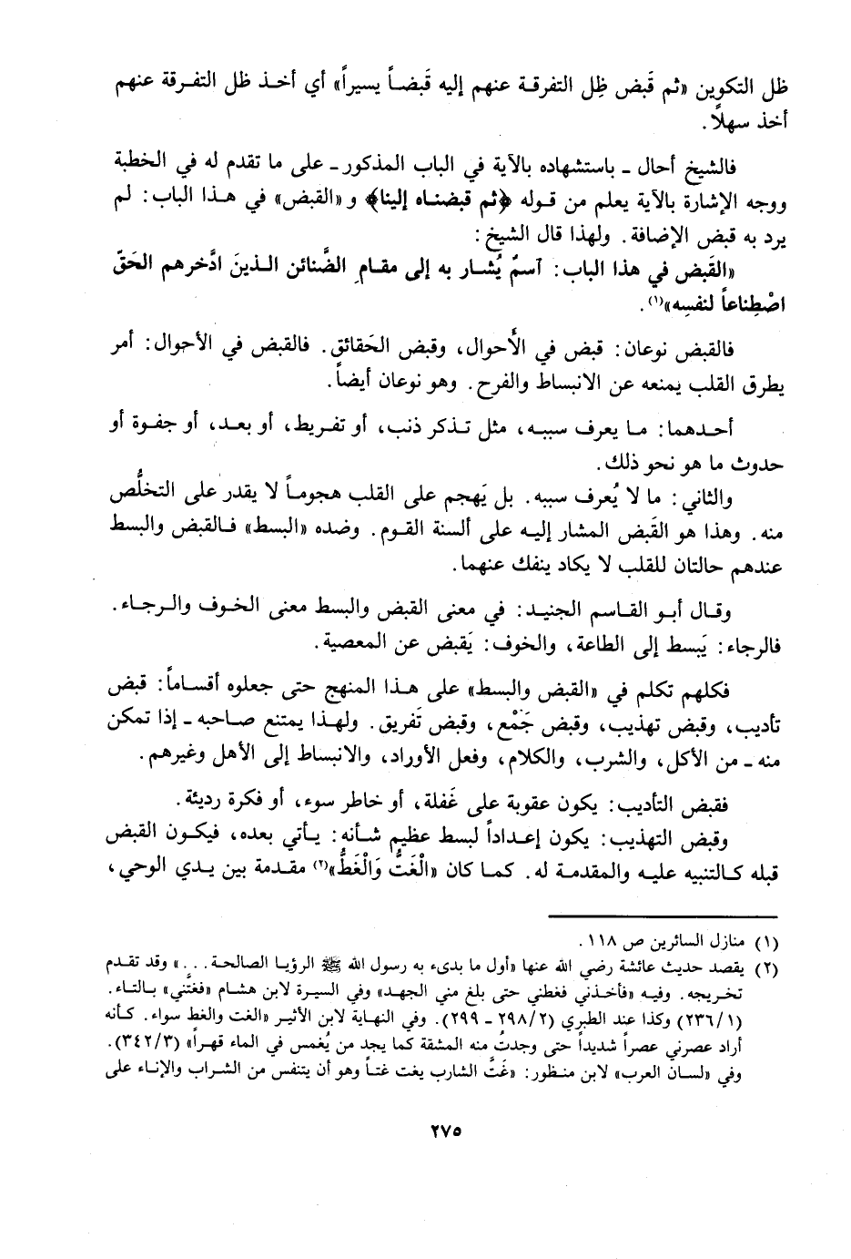 فَكُلُّهُمْ تَكَلَّمَ فِي الْقَبْضِ وَالْبَسْطِ عَلَى هَذَا الْمَنْهَجِ حَتَّى جَعَلُوهُ أَقْسَامًا: قَبْضُ تَأْدِيبٍ، وَقَبْضُ تَهْذِيبٍ، وَقَبْضُ جَمْعٍ، وَقَبْضُ تَفْرِيقٍ، وَلِهَذَا يَمْتَنِعُ صَاحِبُهُ إِذَا تَمَكَّنَ مِنْهُ مِنَ الْأَكْلِ، وَالشُّرْبِ، وَالْكَلَامِ، وَفِعْلِ الْأَوْرَادِ، وَالِانْبِسَاطِ إِلَى الْأَهْلِ وَغَيْرِهِمْ،